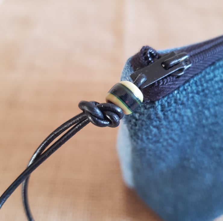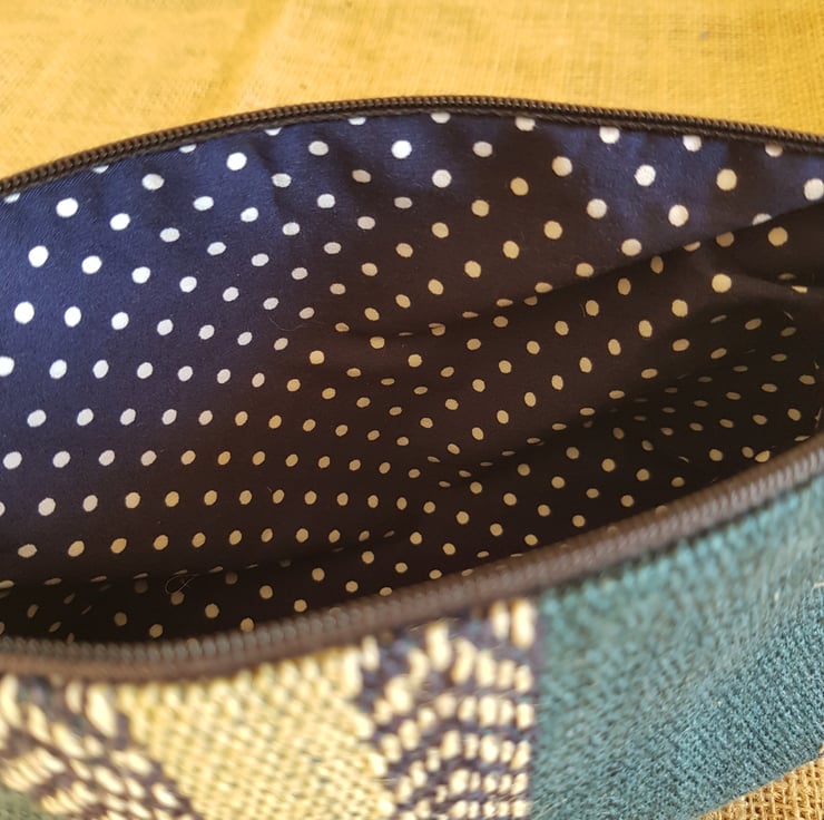 The front fabric is a remnant of a stripped jute and cotton fabric the back is denim from repurposed jeans. The purse is lined with a polka dot navy cotton. Both outer and lining fabrics are lined with a cotton interfacing. The zip is a charity shop find and is reused.