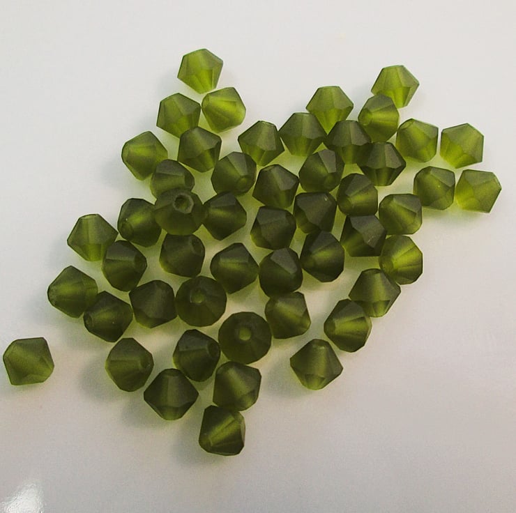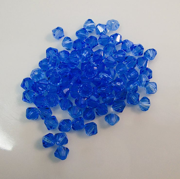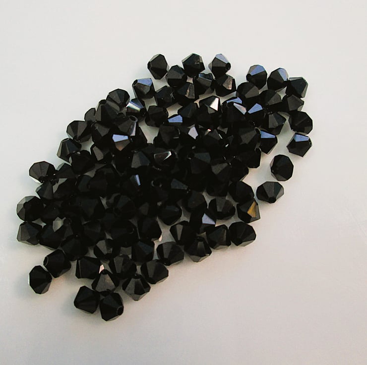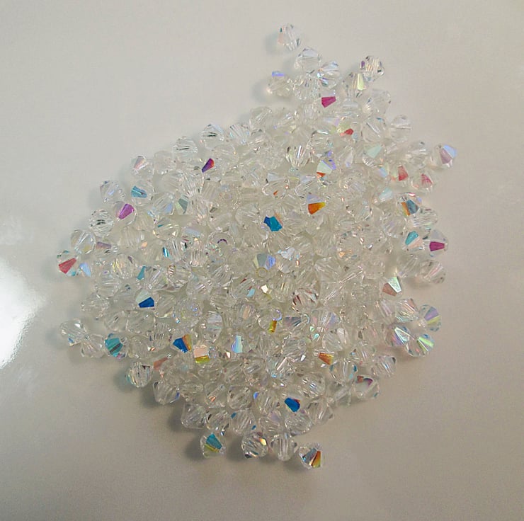 A bundle of 4mm czech glass bicone beads in the colours of crystal ab, jet, sapphire and frosted olivine
