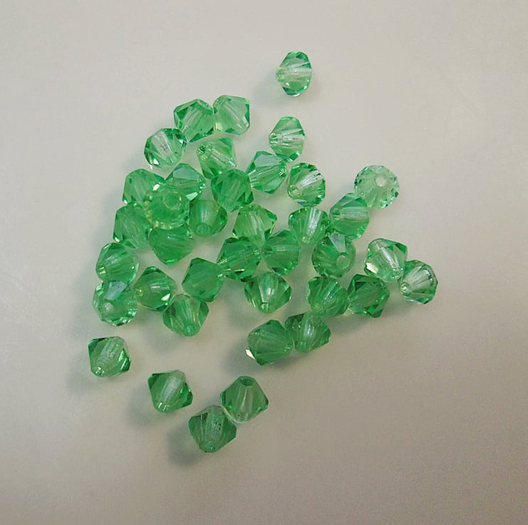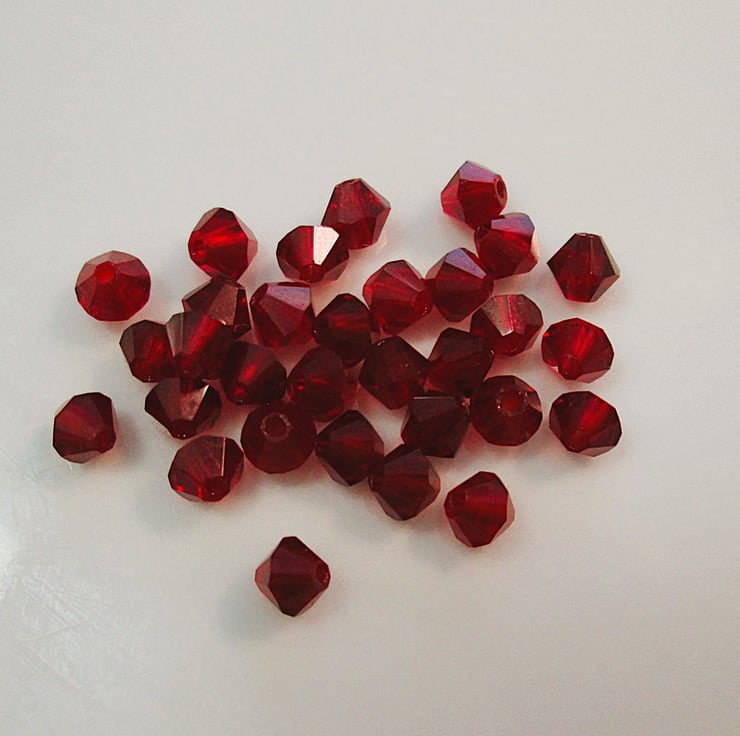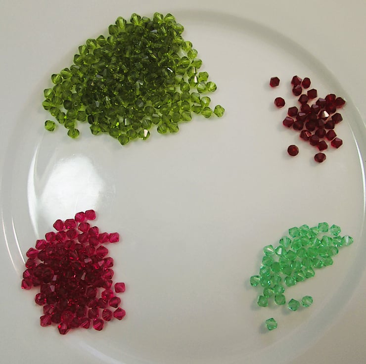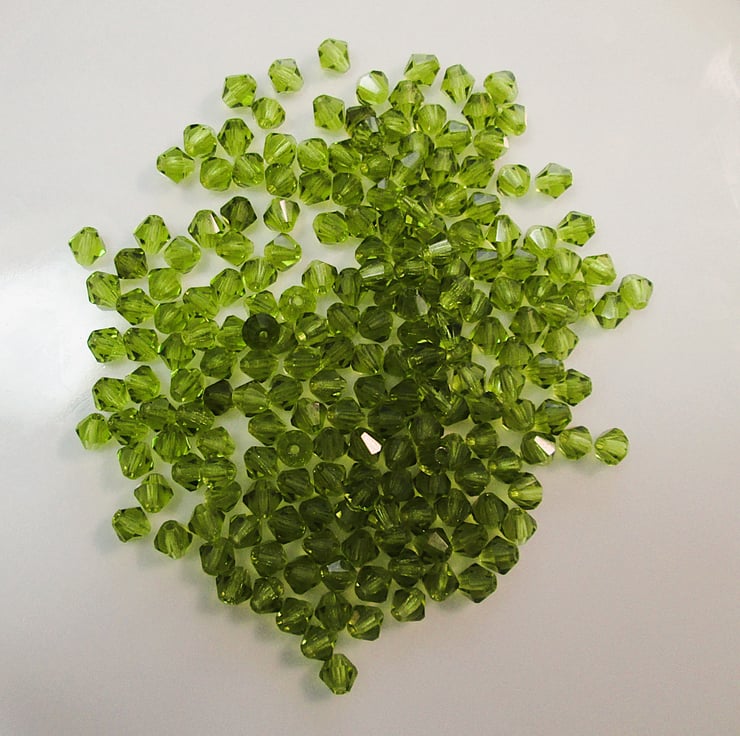 A bundle of 4mm czech glass bicone beads in the colours of olivine, siam, dark rose and light green