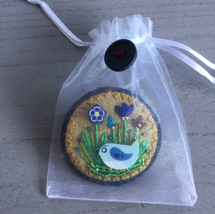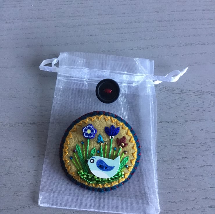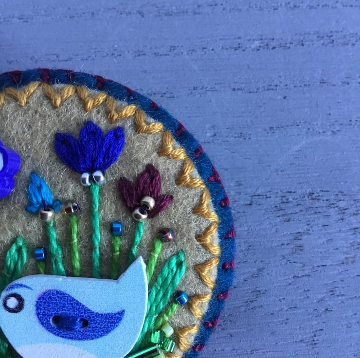 This Hand Embroidered Blue Bird Brooch has a nature scene drawn in embroidery threads and beads. A lovely wooden Blue Bird button is sewn onto circles of golden yellow and dark blue felt. She sits in the sunshine on a ground nest of green beads, underneath a blue button Flower, hand embroidered blue and berry red Flowers, with golden, blue and garnet coloured beads.