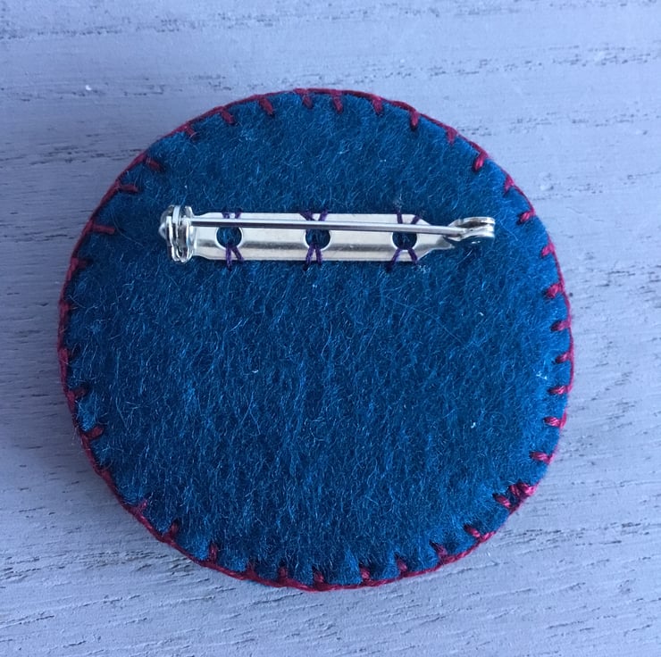 This Brooch is 2 inches (5 cms) in diameter. A metal brooch pin with a safety catch for secure wear is sewn on the back. A nice wearable size.