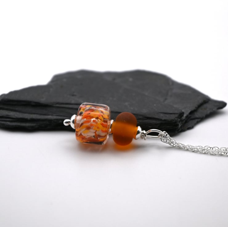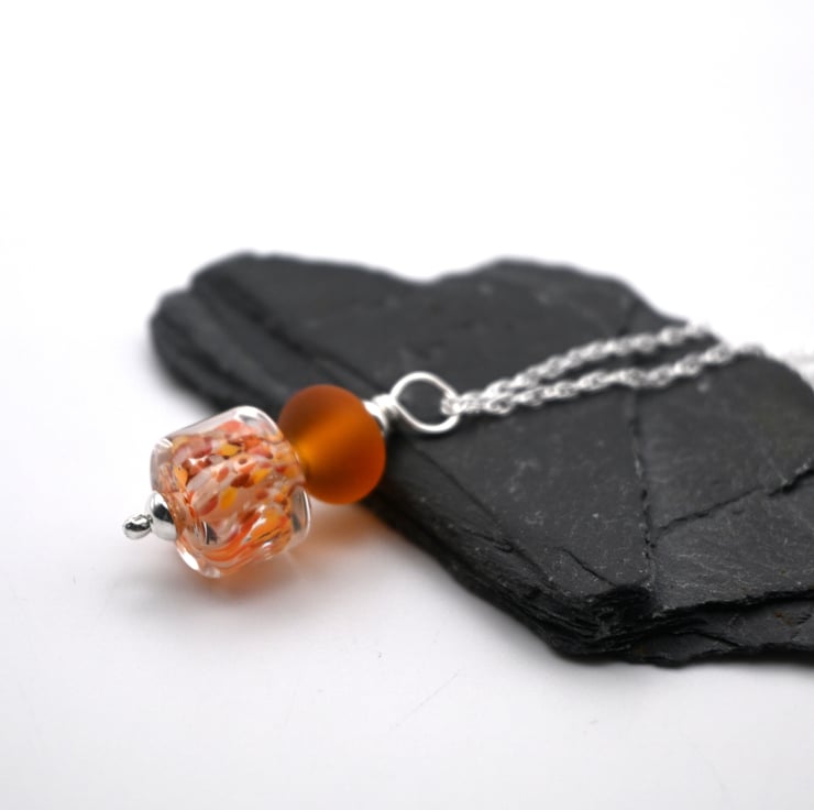 A sterling silver chain which features a handmade lampwork glass pendant made with orange and amber glass.