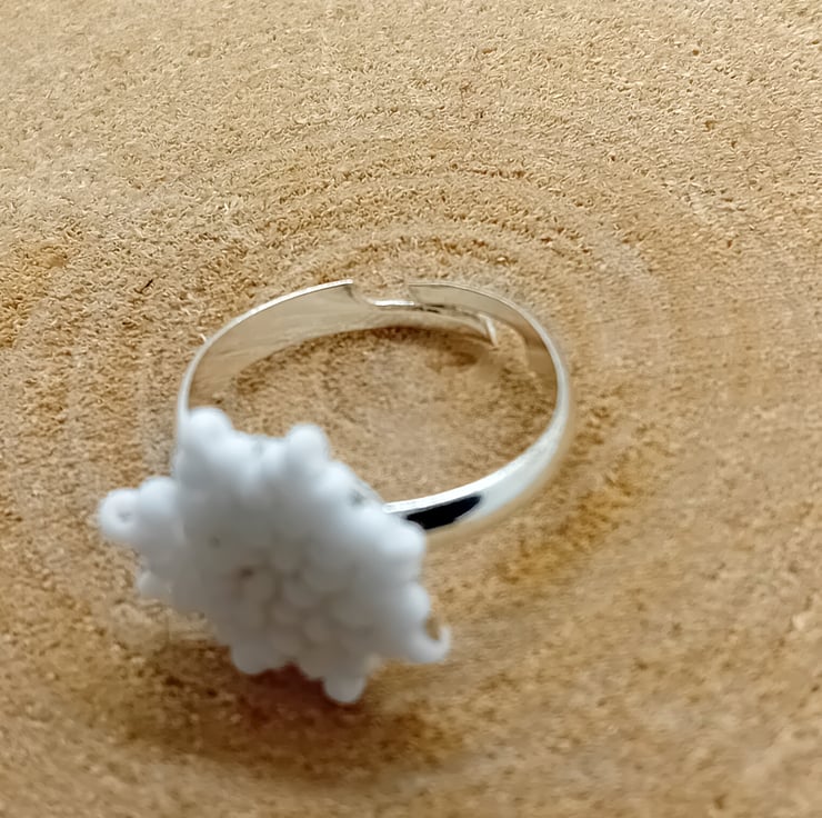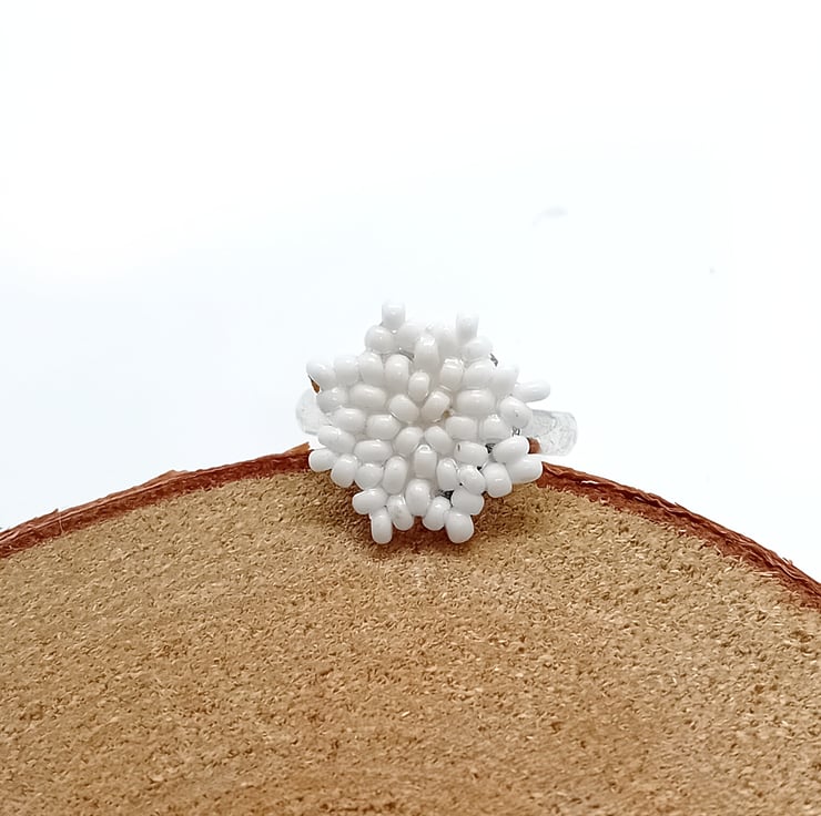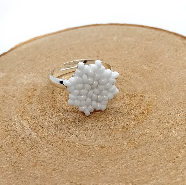 This cute white beaded snowflake adjustable ring is great for the winter season and is adjustable to fit most fingers.