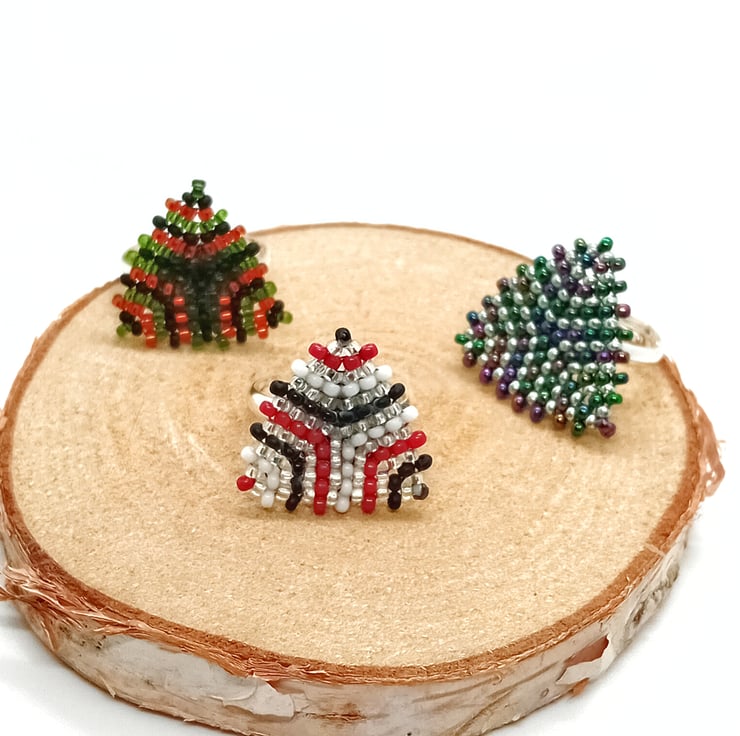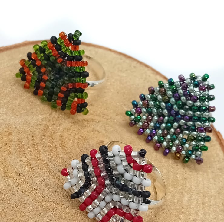 These psychadelic and funky beaded striped triangle adjustable rings are unusual and adjustable to fit most fingers.