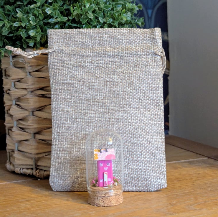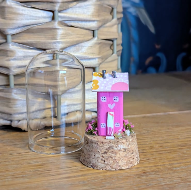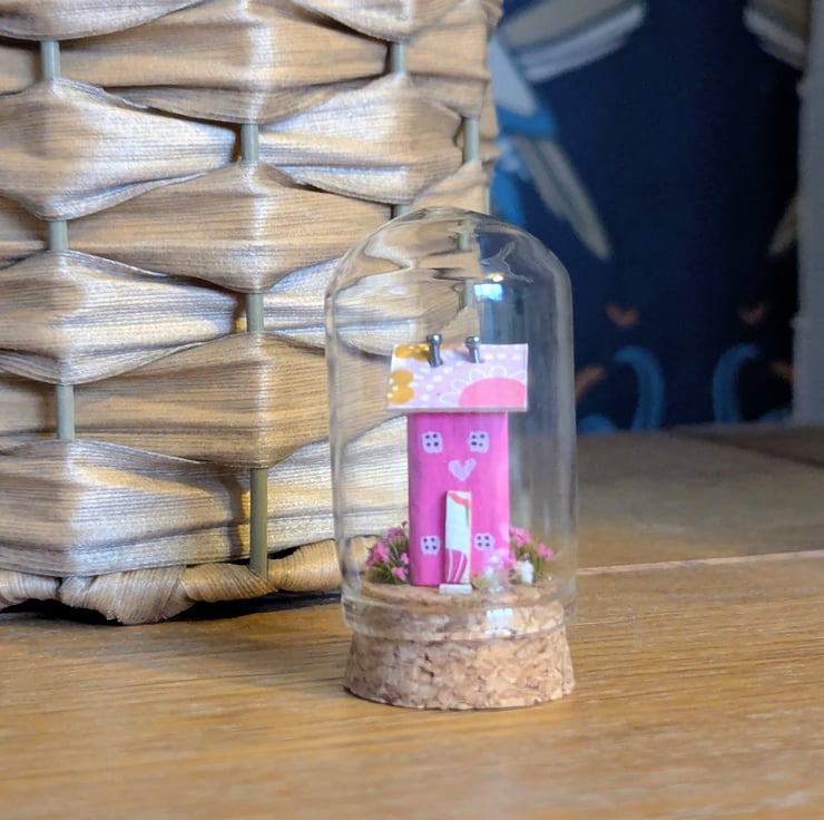 Welcome to Pink Cottage, a miniature wooden cottage within a tiny glass cloche.