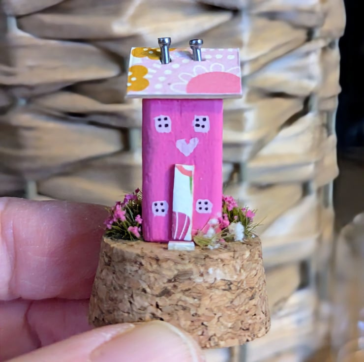 The tiny cottage has a floral decoupaged roof and door, painted heart detail and nail chimneys.