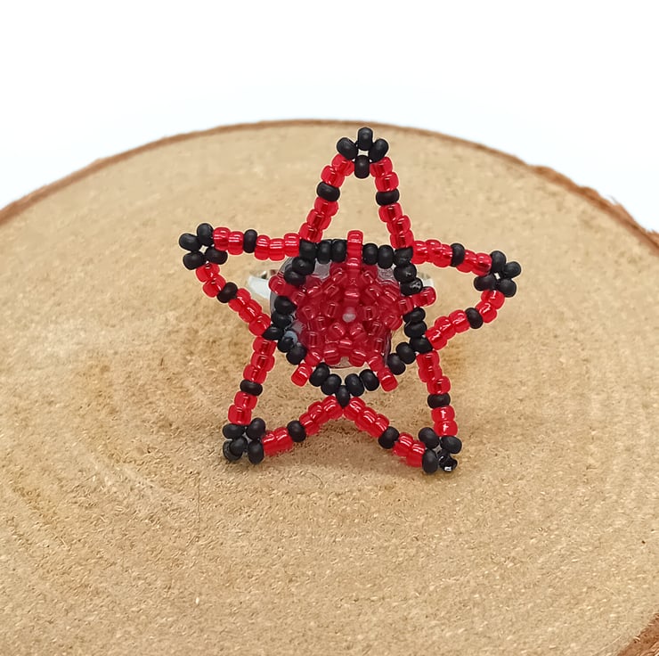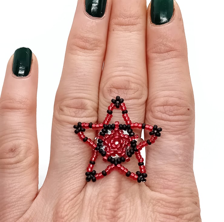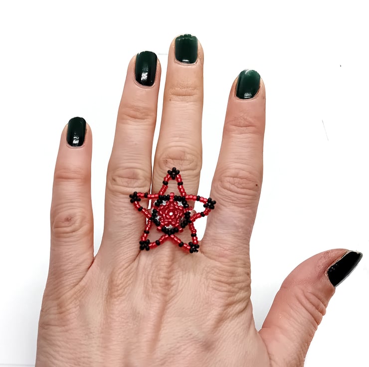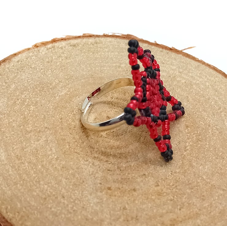 This red and black beaded pentacle adjustable ring has been lovingly created using seed beads and the ring base is adjustable to fit most fingers.