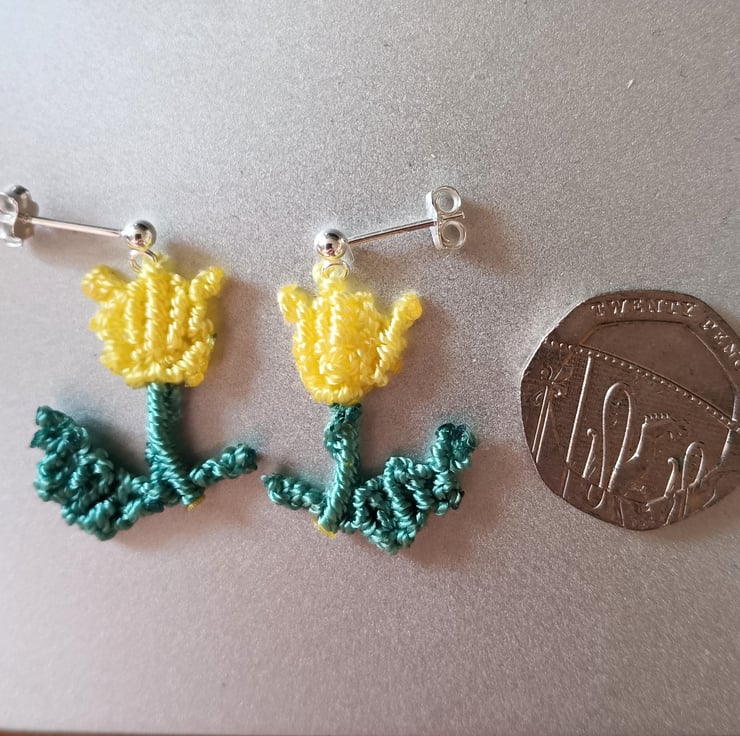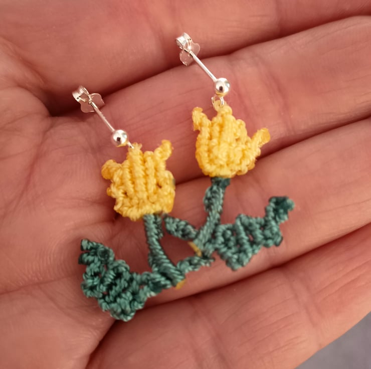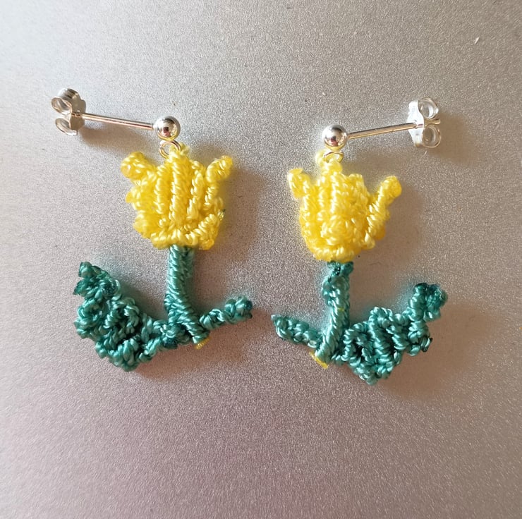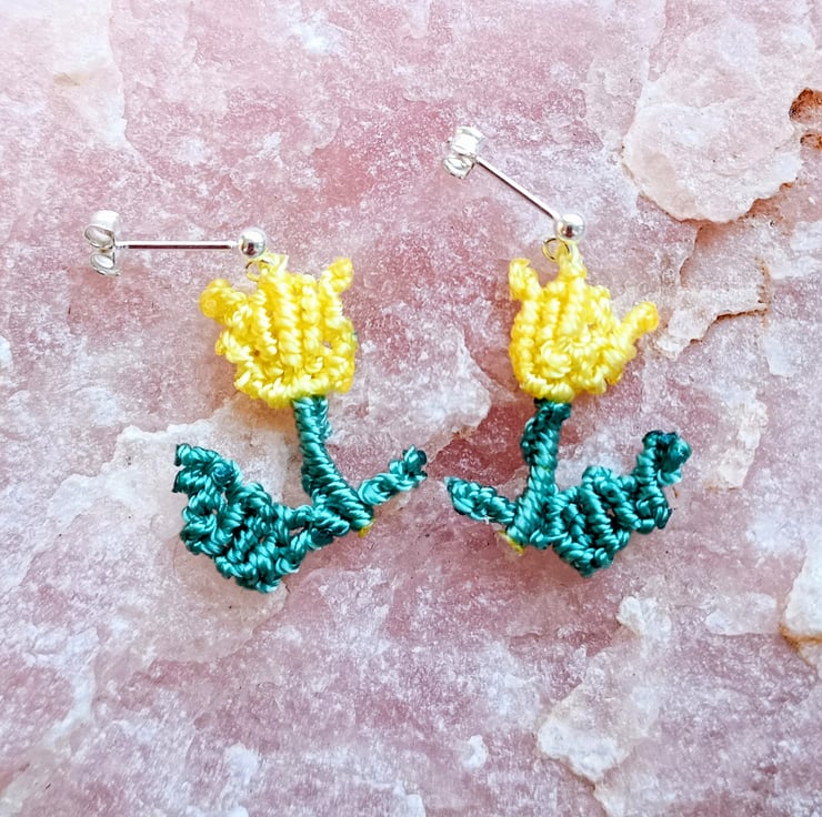 Delicate floral macrame cord earrings, full of beautiful feminine charm. Bright yellow and leaf green, hand knotted macrame tulip flowers, suspended from 925 sterling silver stud ear fittings. Extremely lightweight as made only with 1mm nylon cord, finished with a secure stud and butterfly back.