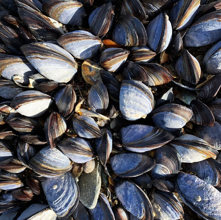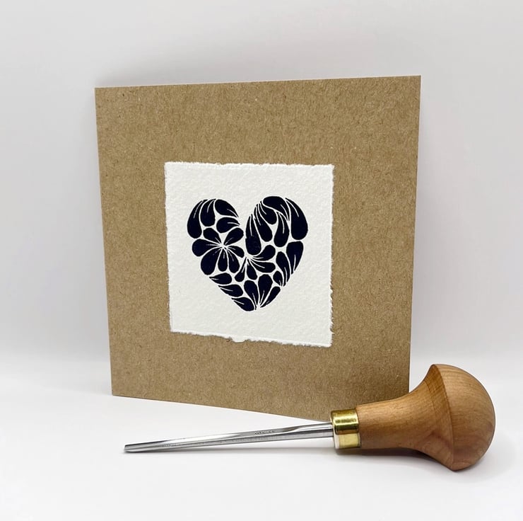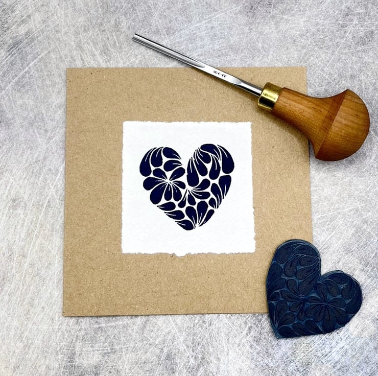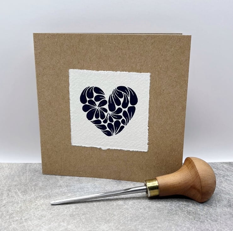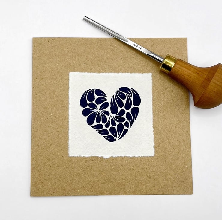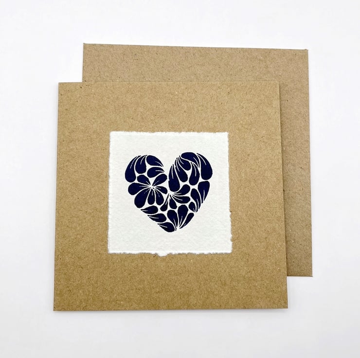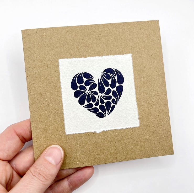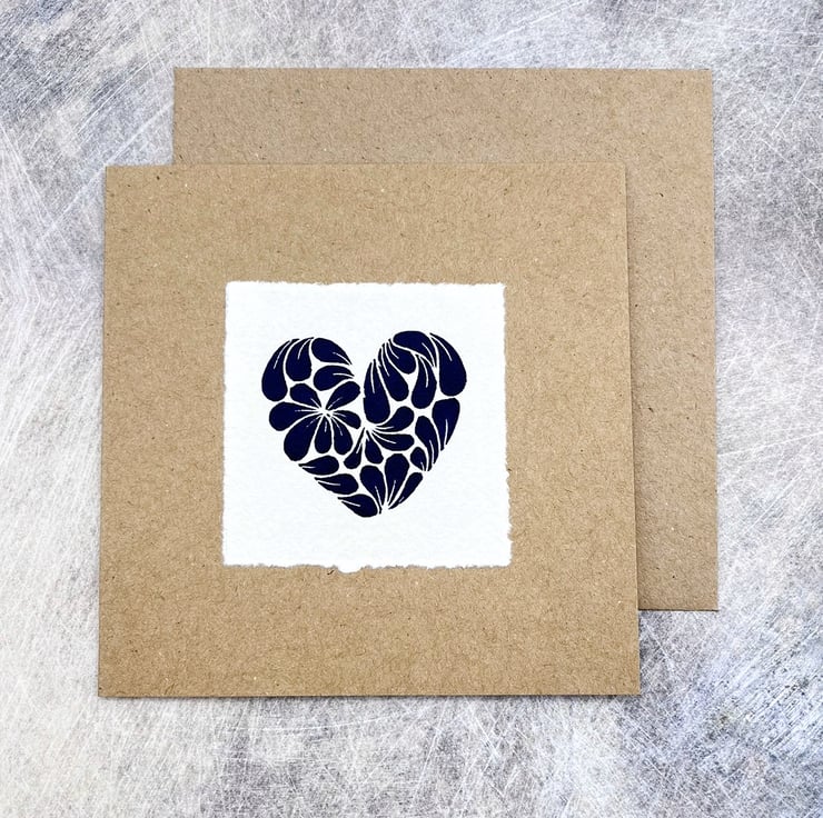 Original Lino print Heart, inspired by a cluster of Cornish mussel shells. Hand printed using non toxic Prussian blue ink on handmade Khadi rag paper and then mounted on recycled Kraft card.