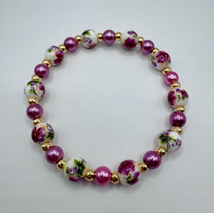 Ceramic bead and glass pearl elasticated bracelet with brass gold plated spacers on a silicone band. approximately 7'' long