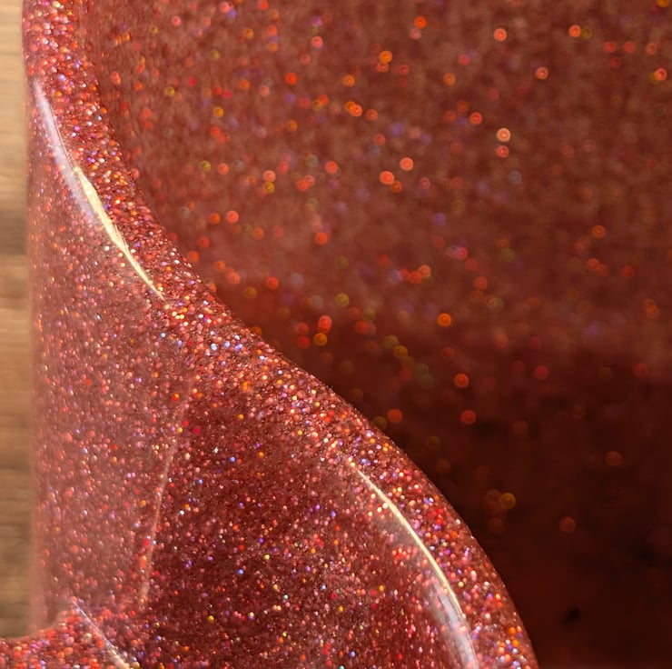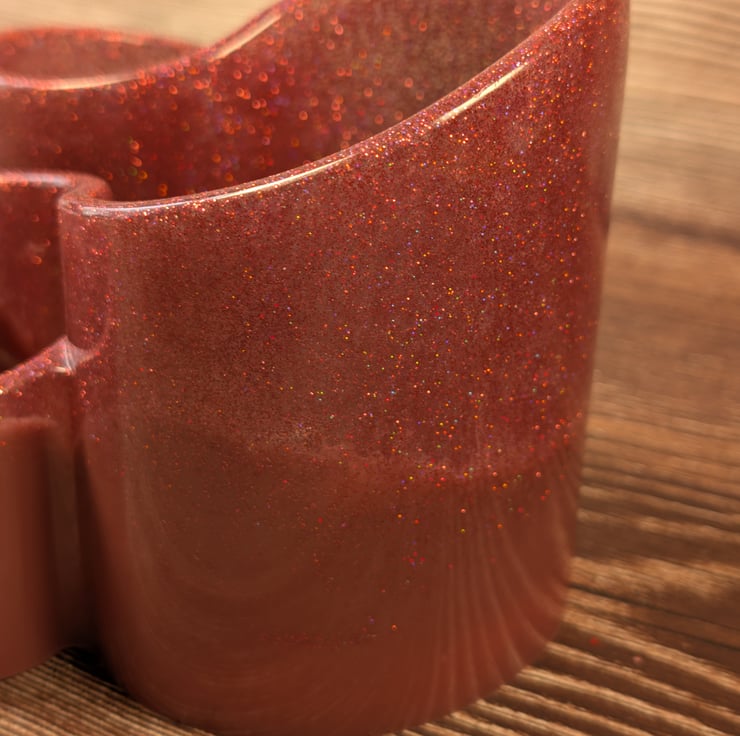 Three-section desk organiser made in a soft dusty rose resin with a fine holographic shimmer throughout. It looks warmer in photos than it does in real life; the actual shade sits between rose and mauve with a muted, satin finish.