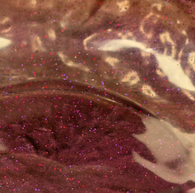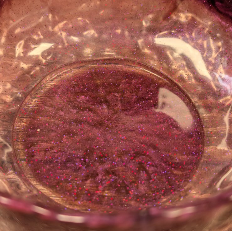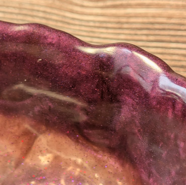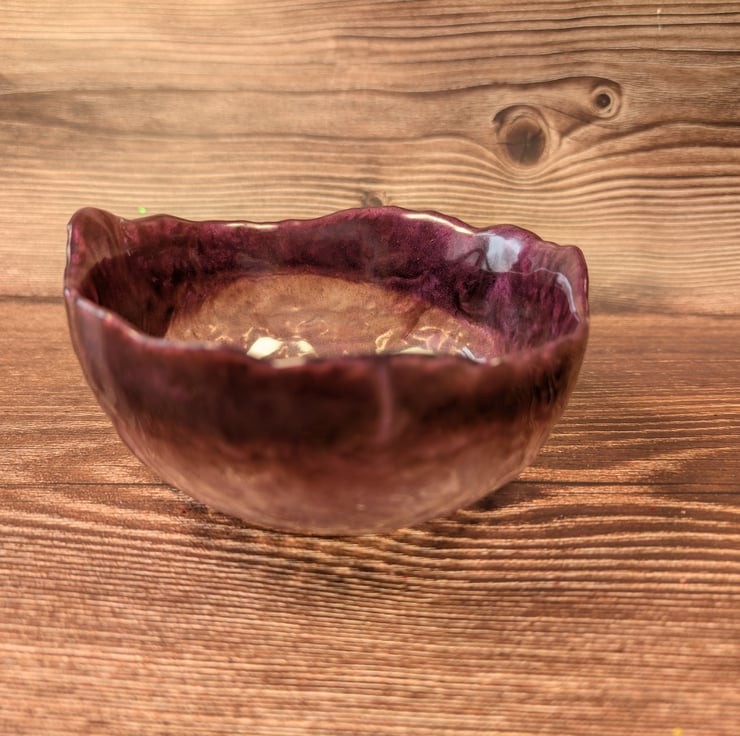 A rich mulberry bowl with a soft, velvety swirl and a subtle shimmer that only shows when the light hits it. Hand-poured in a hammered-glass style mould, giving it the organic, irregular rim that makes these bowls so appealing.