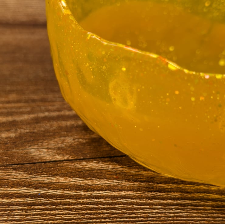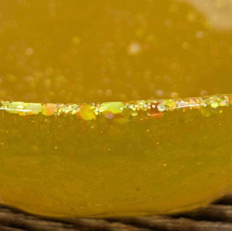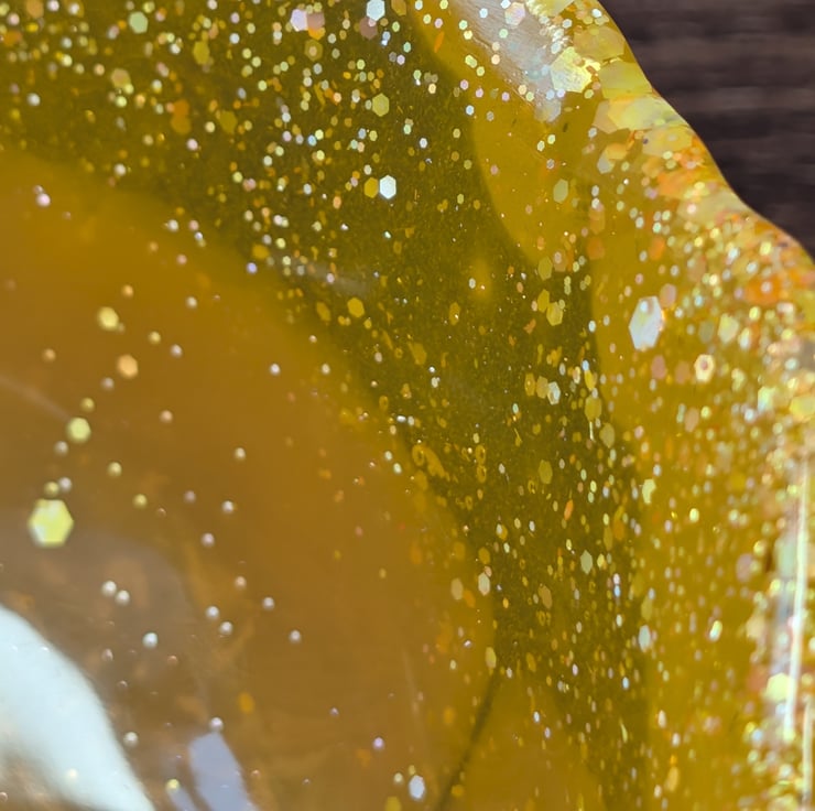 A warm golden trinket bowl made with my own Binevenagh glitter mix from Pour Decisions Supplies. The colour sits somewhere between honey and amber, with soft transparency and a scattered gold shimmer that shows best in daylight.