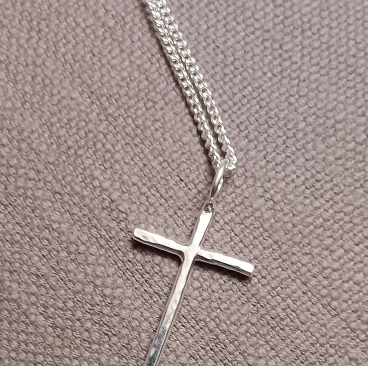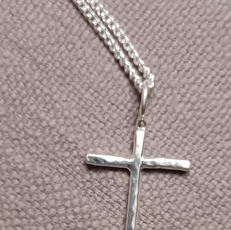 The cross is beaten to provide some texture an sparkle and it hangs from a 46cm (18in) sterling silver curb chain which fastens with a bolt clasp.
