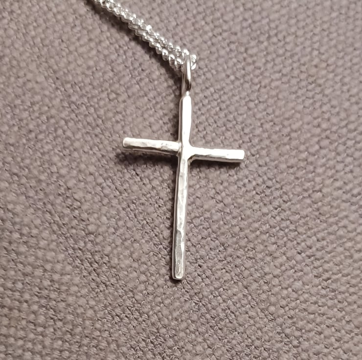 An simple but elegant silver cross, handmade from sterling silver wire. The cross is 2cm wide and 3cm long, with a 0.5cm bail (so 3.5cm tall overall).