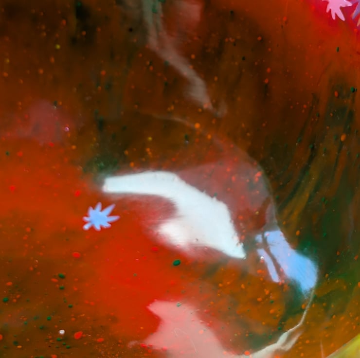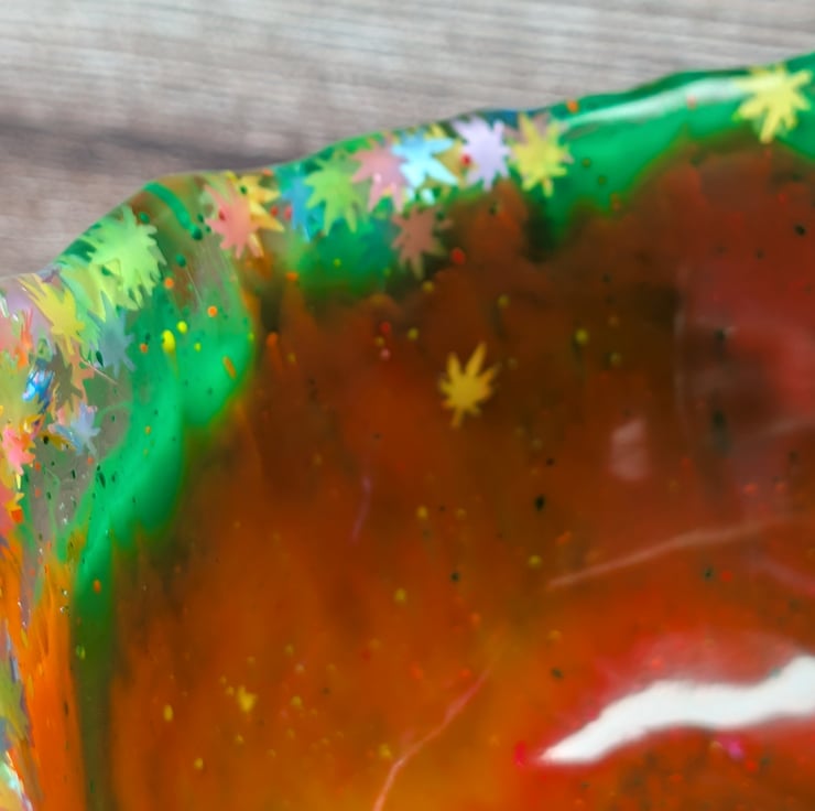 This bowl is a riot of colour in the best possible way. Bright swirls of neon orange, pink and green meet a scatter of tiny multicoloured leaf confetti shaped after the distinctive Cannabis sativa leaf, giving it a bold, festival-inspired finish.