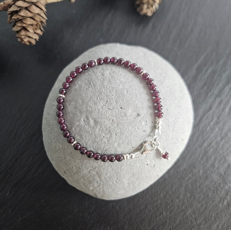 This pretty bracelet is made with 4mm round garnet gemstones which are accented with sterling silver flower-shaped Bali beads. A single garnet gemstone hangs next to the clasp as a charm bead. The bracelet fastens with a sterling silver carabiner clasp and is threaded on strong and flexible 49-strand jewellery wire. All the metal components of the bracelet are sterling silver.