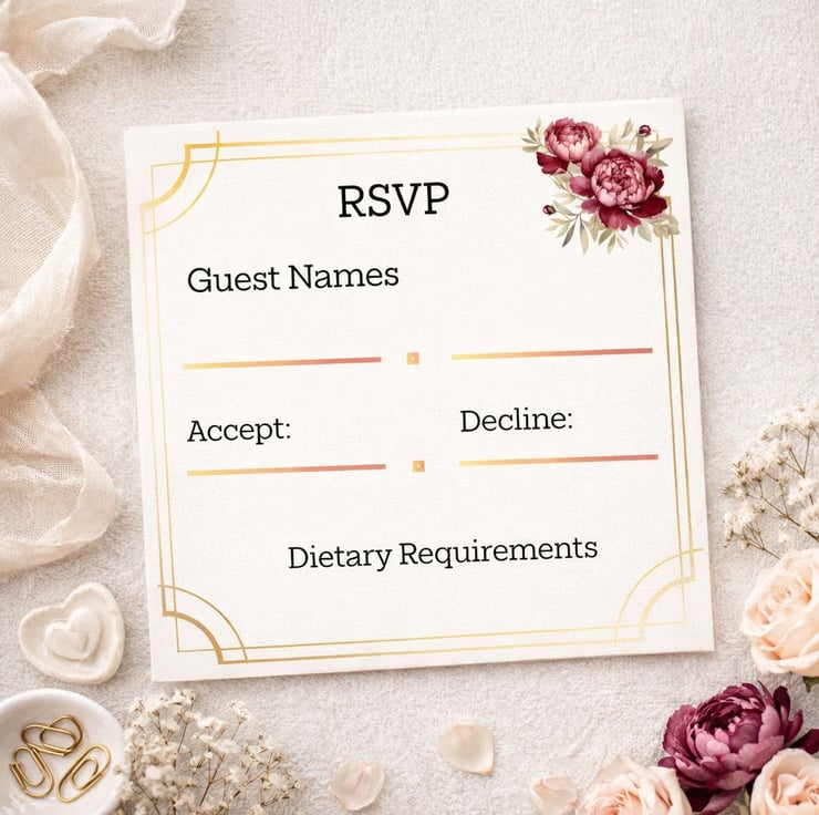 This listing is for a personalised wedding invitation with matching RSVP card. The layout is clear and balanced, allowing your names and wedding details to take centre stage while the floral accent adds a romantic touch. Printed on quality card stock and supplied as flat cards, this set is ideal for couples seeking a refined yet accessible option.