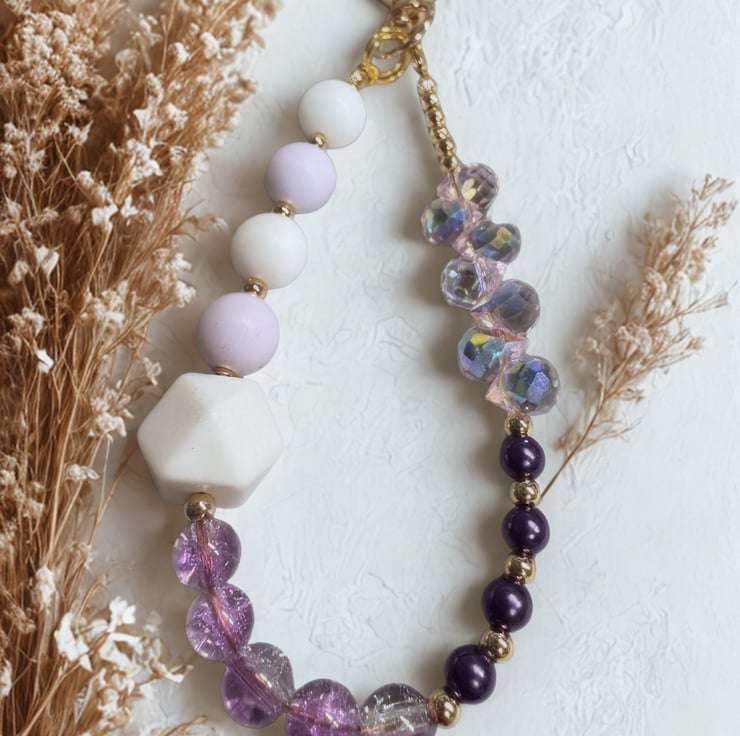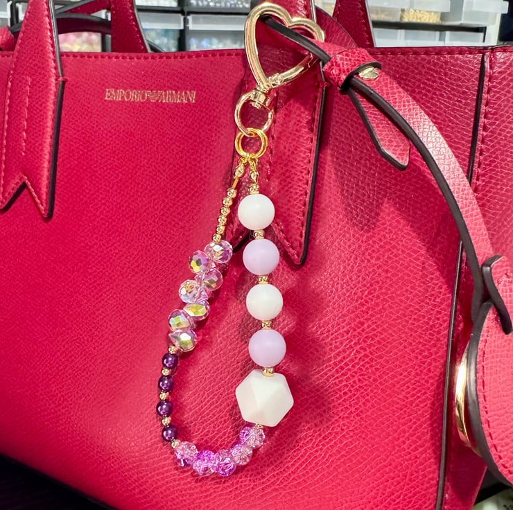 Handbag charm with purple and lavender beads, approximately 6'' long with a heart shaped clasp