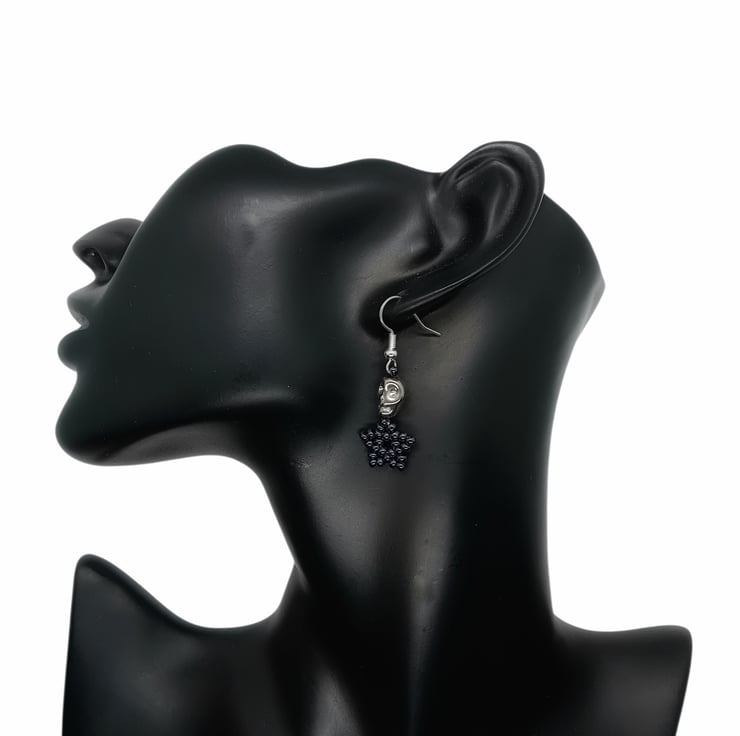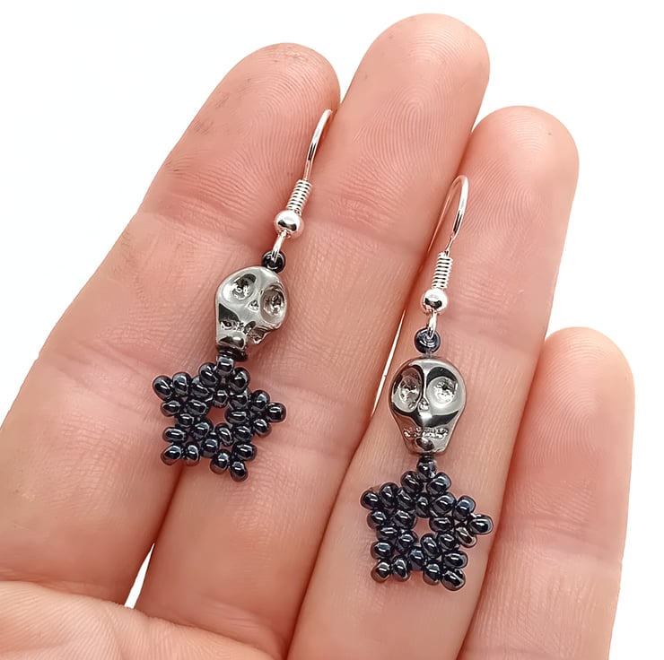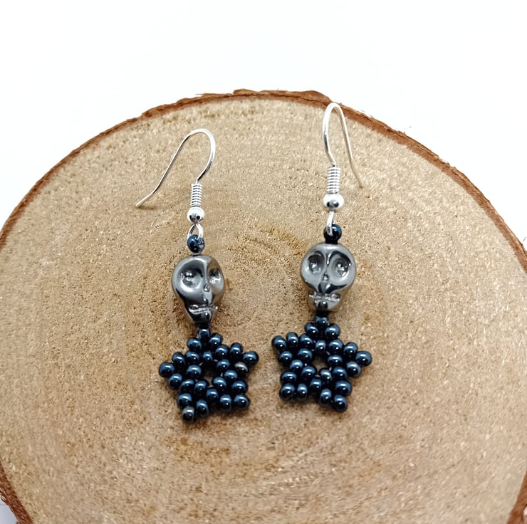 These cute earrings are made with haematite black beaded stars and metallic silver acrylic skull beads, hanging from silver plated ear wires.