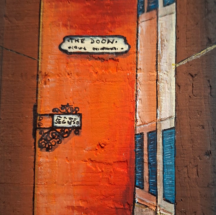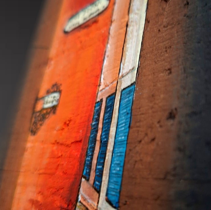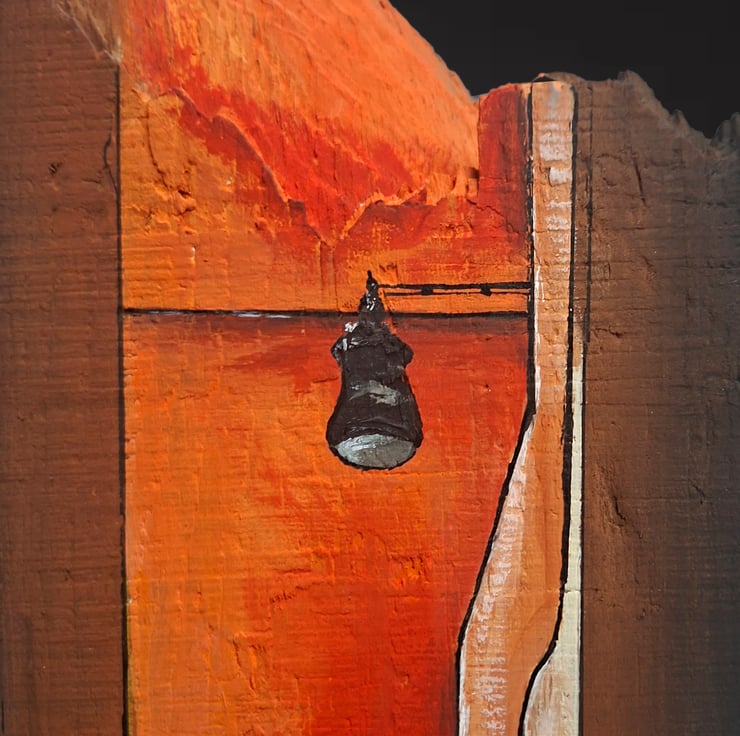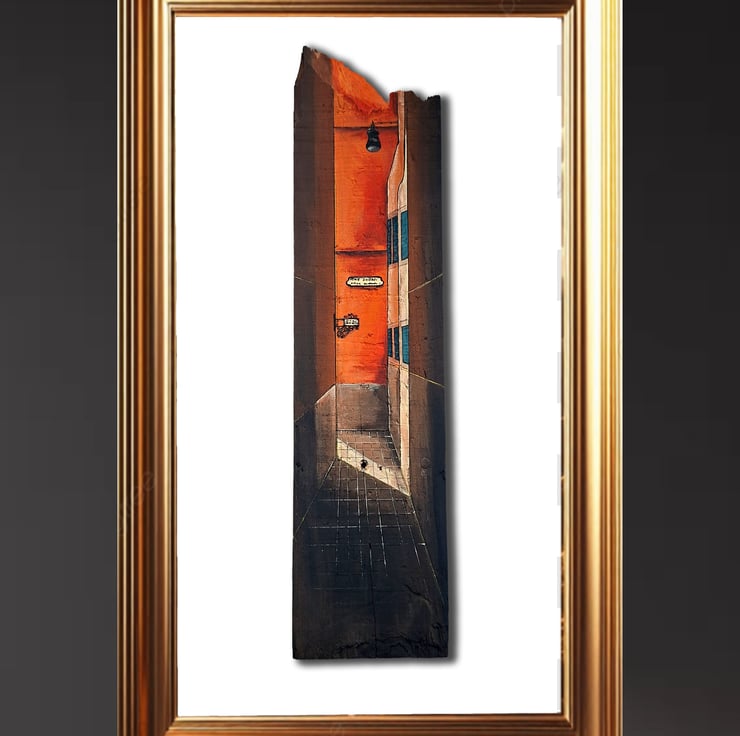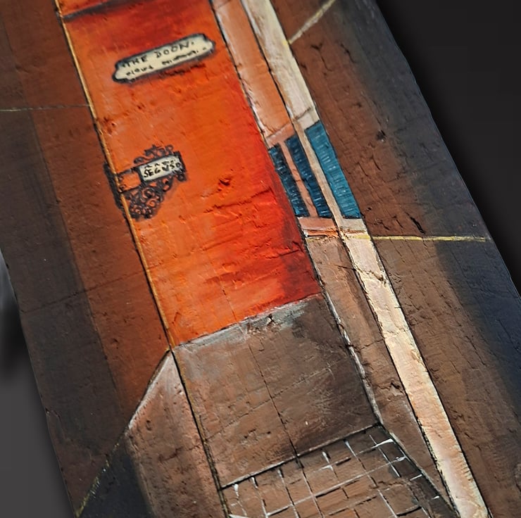 The artwork is hand-painted in acrylic on wood, using layered paint and trompe-l’œil perspective to create the illusion of depth. The natural texture and edges of the plank are part of the composition, making it a three-dimensional painted object rather than a flat image.