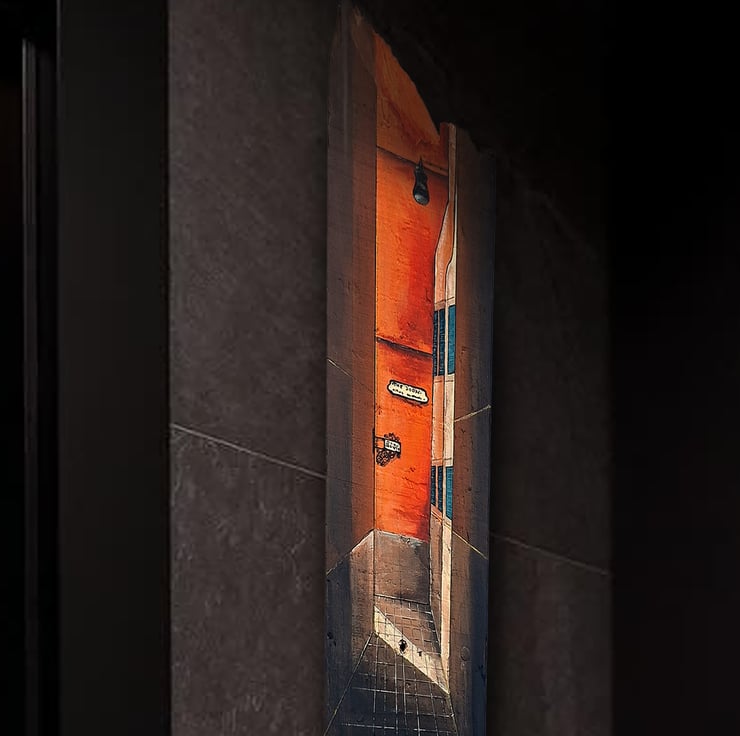 The artwork is inspired by narrow Mediterranean alleyways, warm southern light, and trompe-l’œil perspective, combining old European architecture with a cinematic, atmospheric mood.