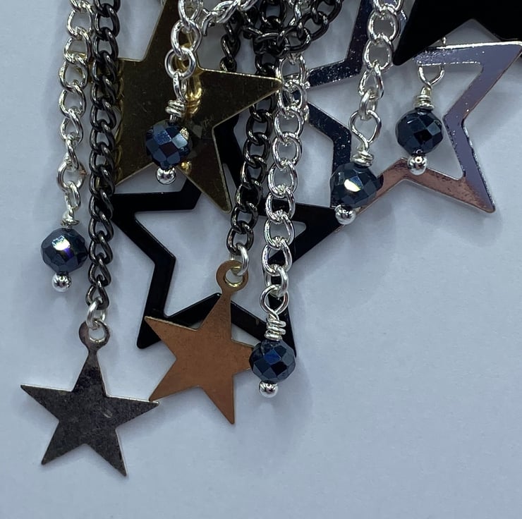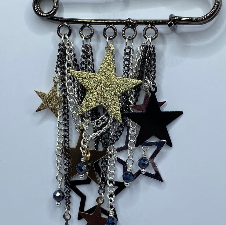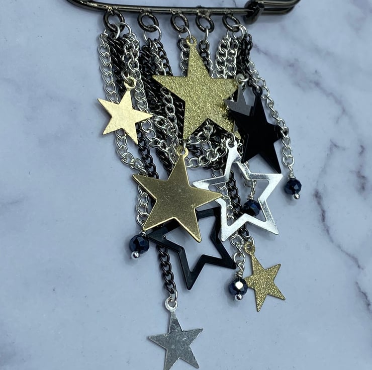 I decided that I should make more brooches, so with this kilt pin I decided to channel a bit of my early 2000s style and remembered the kind of things I used to adorn my pinstripe jackets with! It's covered in black and silver tone chains with cascading gold, silver and black star charms and tiny faceted spinel stones that twinkle in between the stars.