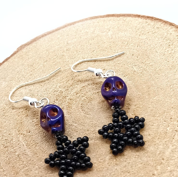 These funky earrings are made with beaded stars and pearlescent and metallic purple acrylic skull beads, hanging from silver plated ear wires.