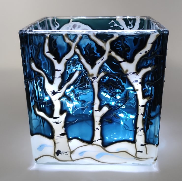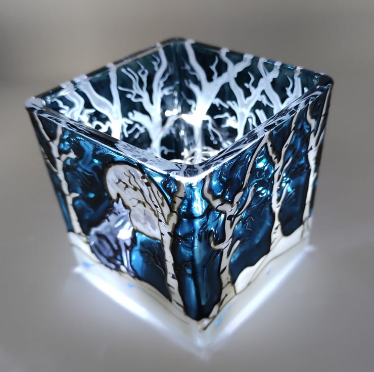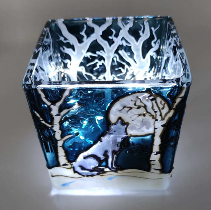 Candle holder, hand painted glass, wolf in snowy forest howling at the moon