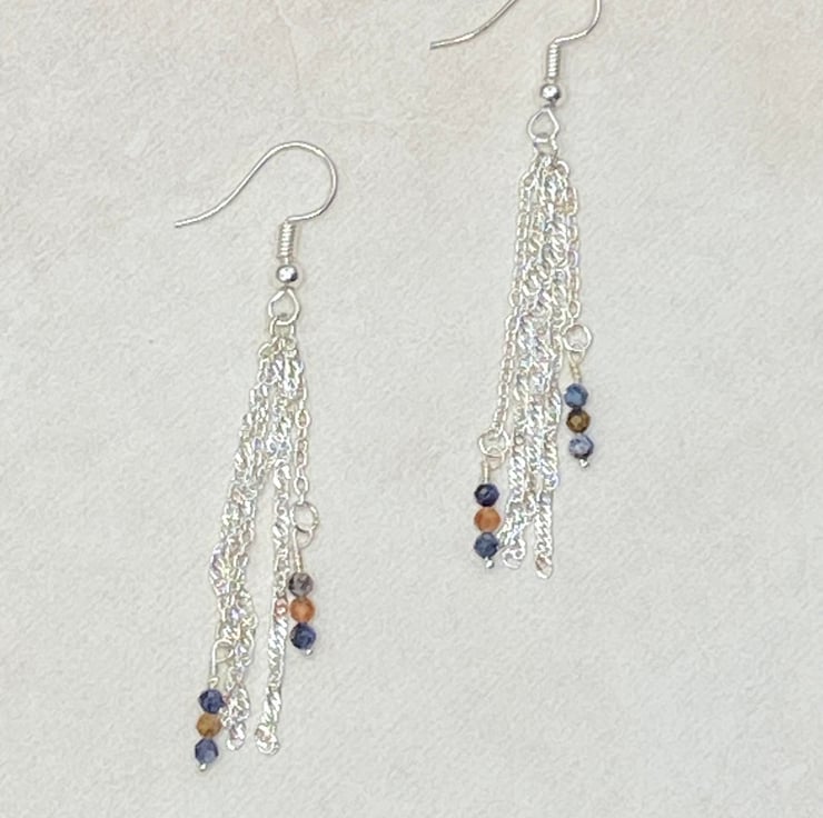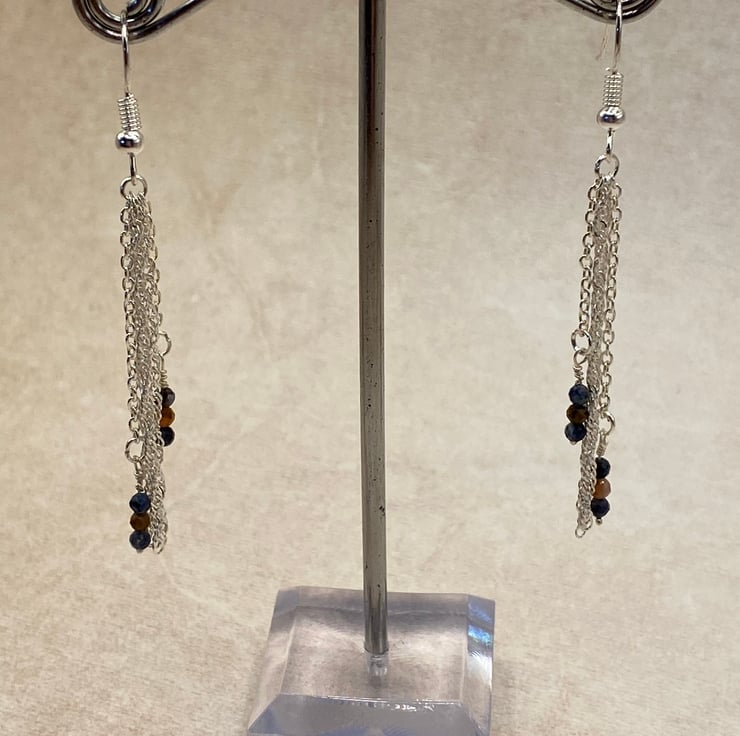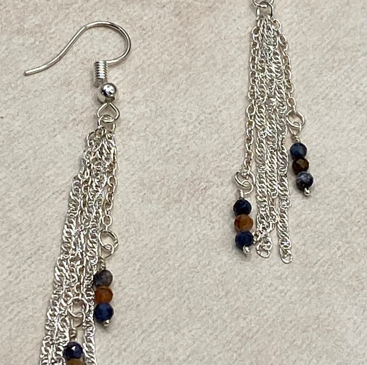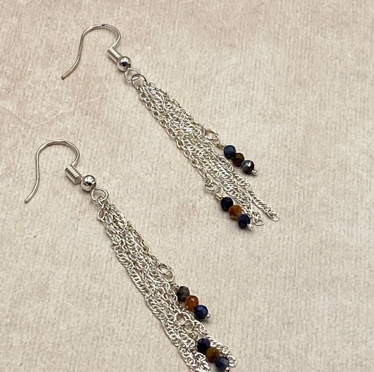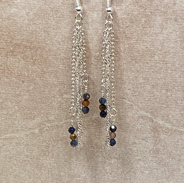 Silver plated chain chandelier earrings with tiny pietersite stones