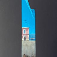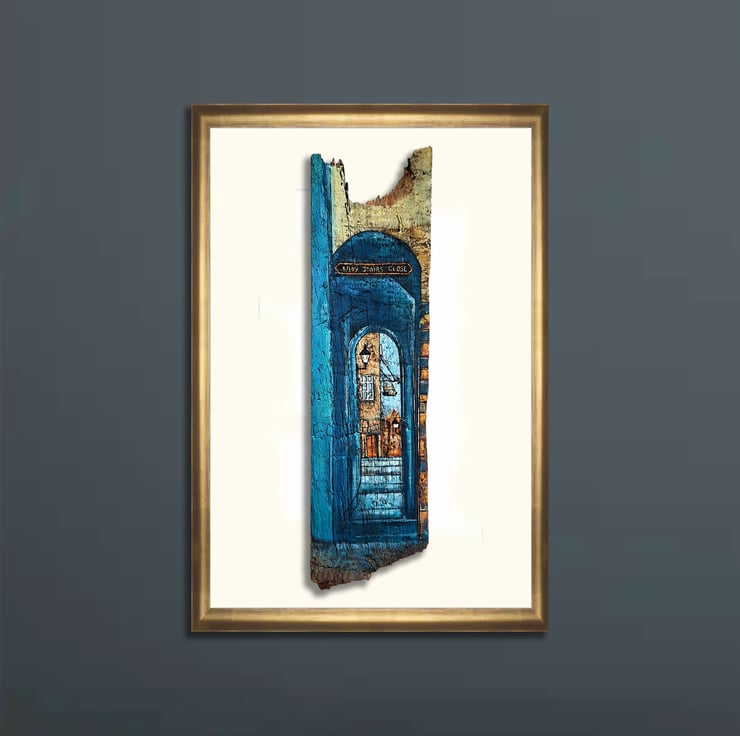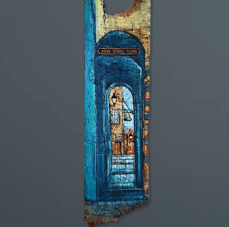This painting shows a famous narrow passage in Edinburgh called Lady Stair's Close. It is painted on a cracked, rustic piece of wood that looks like old stone. The dark blue arch creates a "window" looking into a warm, glowing street with a classic lantern.