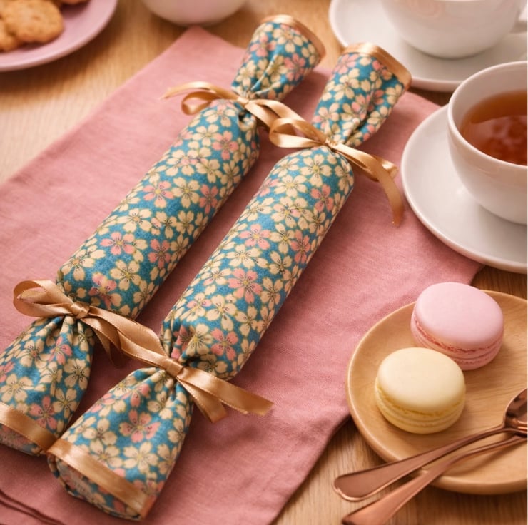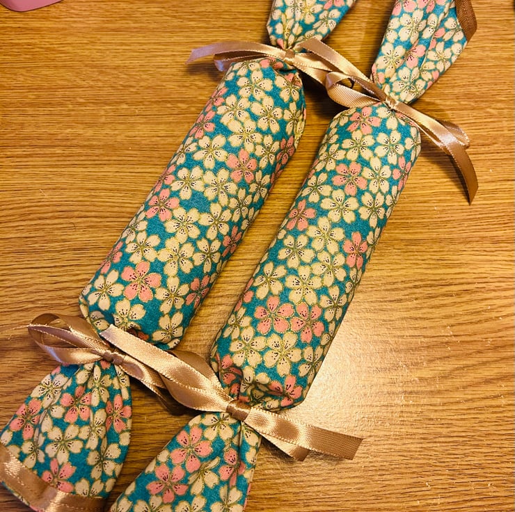 These lovely reusable fabric crackers will add style to your celebration dinner table, they are made from a stunning Japanese fabric edged with champagne ribbon and tied with the same