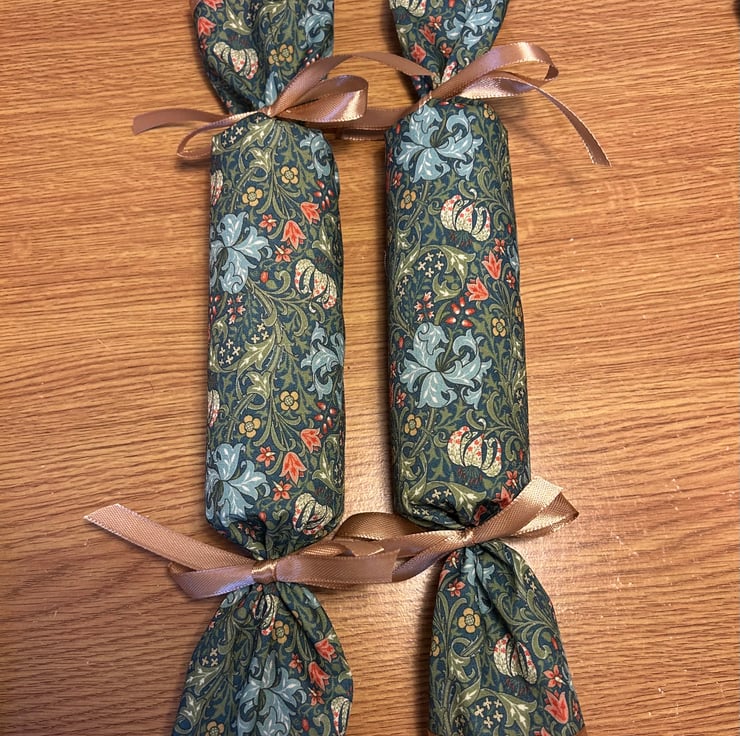 These lovely reusable fabric crackers will add style to your celebration dinner table, they are made from a lovely William Morris style fabric edged with champagne ribbon and tied with the same