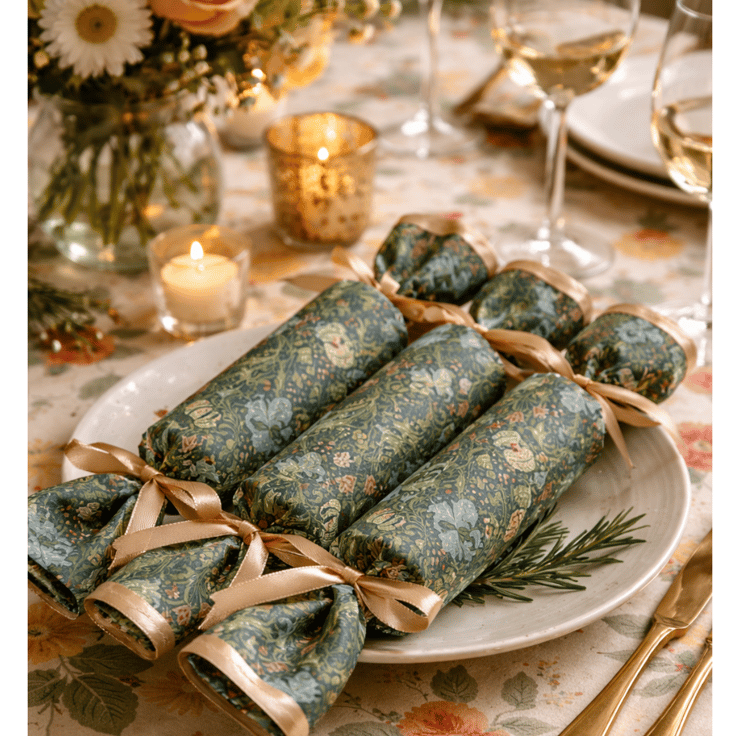 These lovely reusable fabric crackers will add style to your celebration dinner table, they are made from a lovely William Morris style fabric edged with champagne ribbon and tied with the same