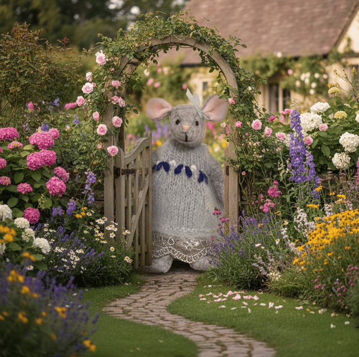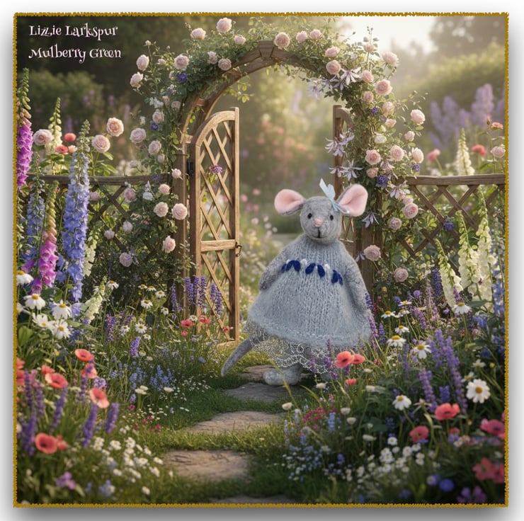 Lizzie Larkspur, in her knitted and embroidered blue dress, trimmed with lace, is a Little Nipper from Mulberry Green. Little Nippers are tiny wood mice who live in a maze of tunnels underneath the barn at Mulberry Farm. All of the Little Nippers are named after herbs and meadow flowers. Sets of clothes, made especially to fit them, are also available in my shop.