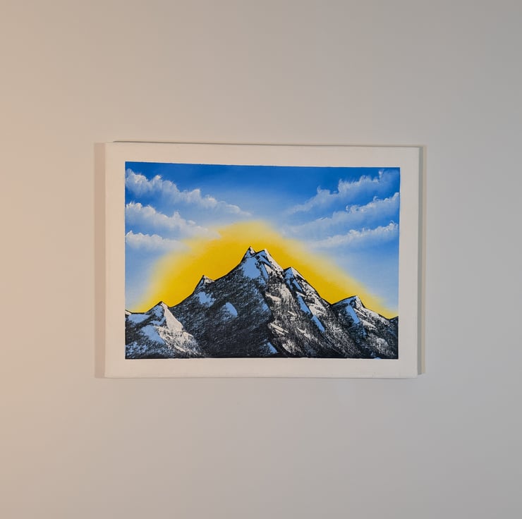 Oil painting on A3 canvas. This is my composition of serene mountain landscape painting featuring snow-capped peaks beneath a bright blue sky, with soft clouds and a radiant golden sunset glowing behind the central summit. Clean, calming, and uplifting—perfect for adding a sense of peace and inspiration to any space.
