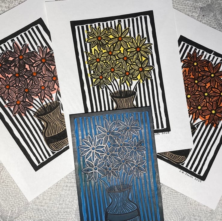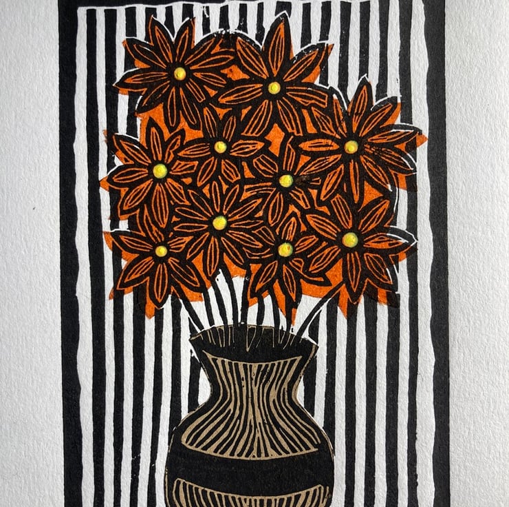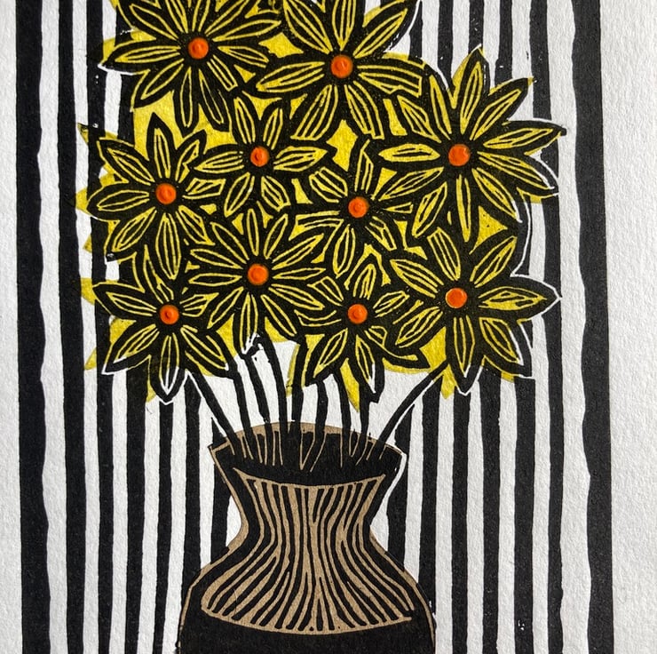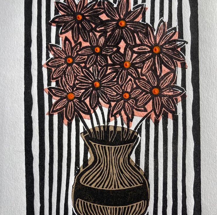 This is a lino cut picture of a vase of flowers created using the Chine Collé printing technique which uses collage paper to add different colours to the print.