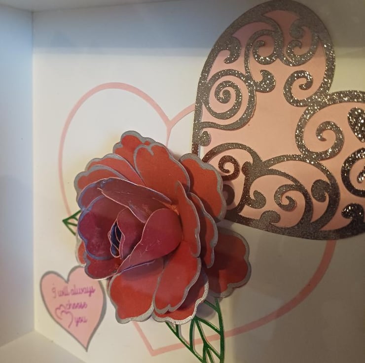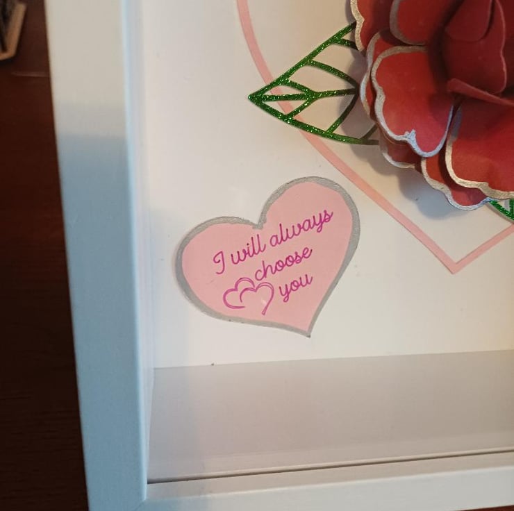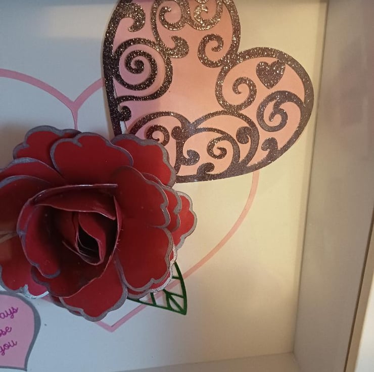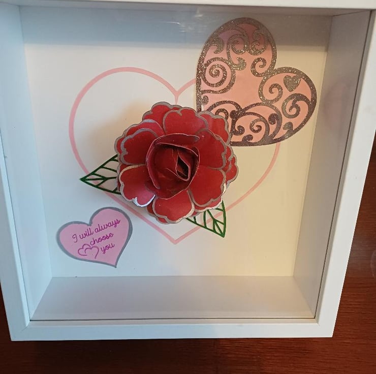 Very simple and elegant 3d picture featuring a hand rolled red rose and pink hearts. The red rose is accented with a silver edge and the pink heart has a silver glitter filigree heart for emphasis. The smaller pink heart say's 'I Will Always Choose You'. Size is 22cm x 22cm square x 6cm deep. It can be hung on the wall or free-standing. The front is an acrylic panel, not glass so much safer.