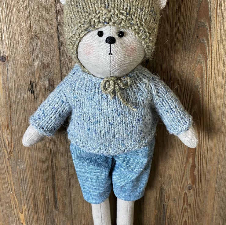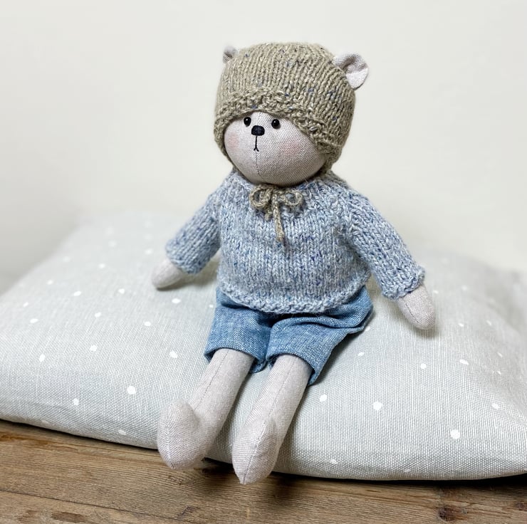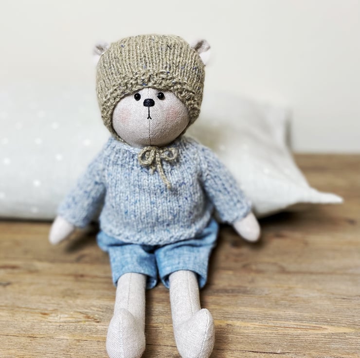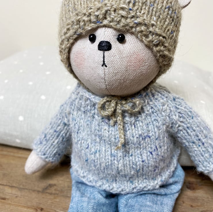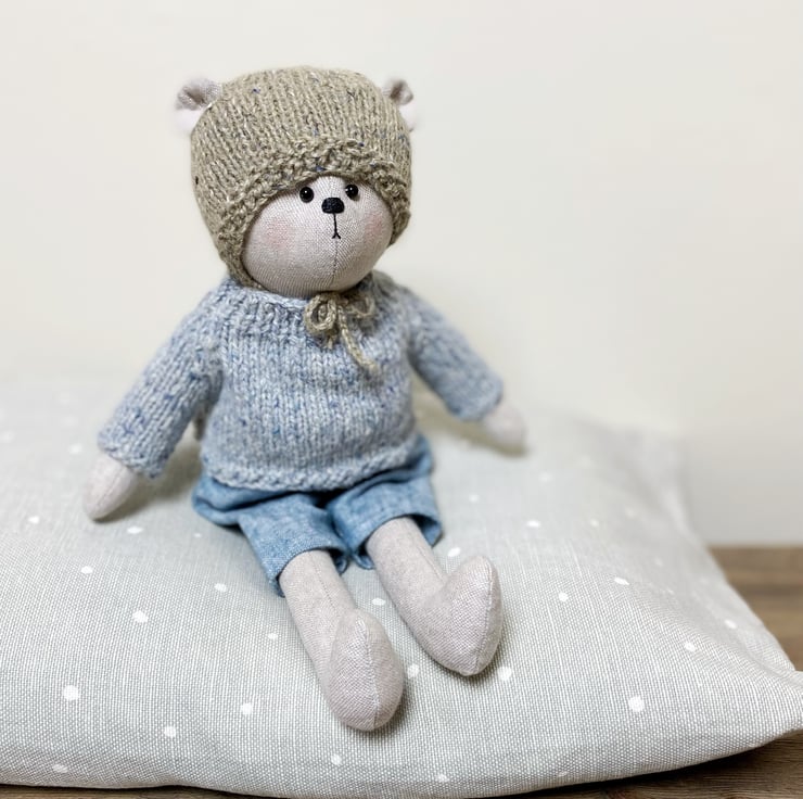 Hamish is an old fashioned cloth type bear with sewn in arms and legs. He’s made from a cotton linen mix fabric and measures approximately 30cms tall. He has been filled with polyester stuffing, has black glass beads for eyes, and an embroidered nose and mouth.