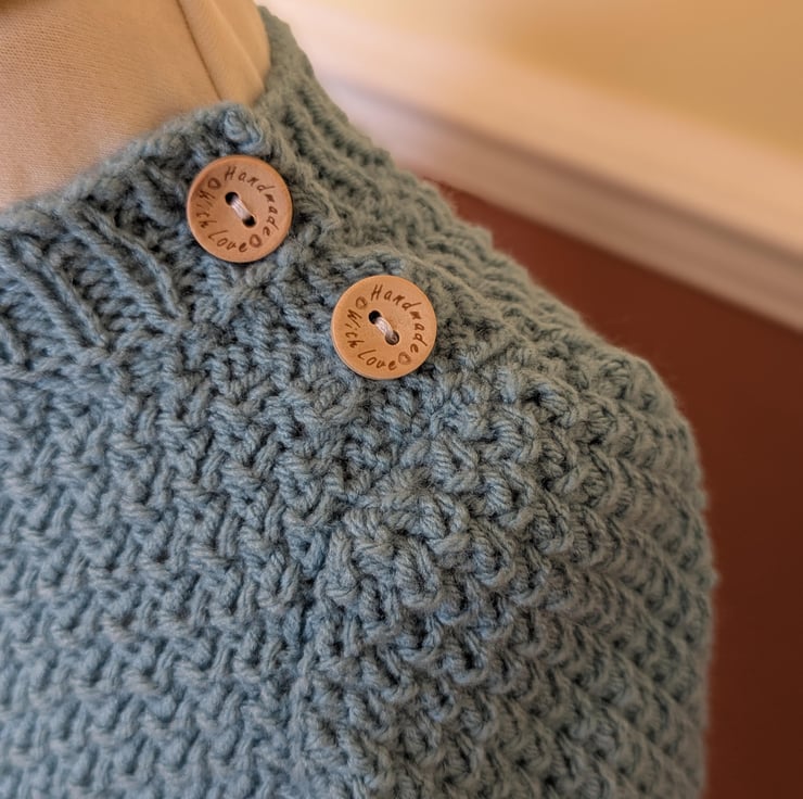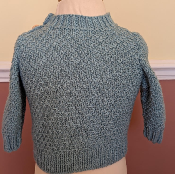 Beautifully hand knitted babies jumper in cable and double moss stitch. Two wooden buttons on left shoulder. Only one available