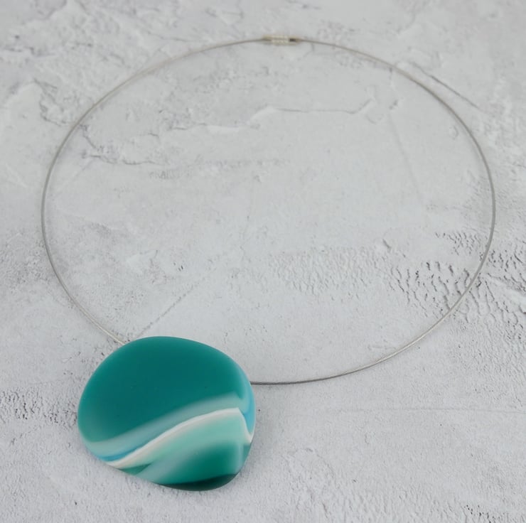 The fused glass pendant is securely fixed to an 'invisible' silver plated bail with industrial strength adhesive. This pendant is 4.5cm (1.75") wide at the widest point, and 3.5cm (1.5") tall. The stainless steel choker is 42.5cm (17") long and fastens with a silver plated screw clasp.