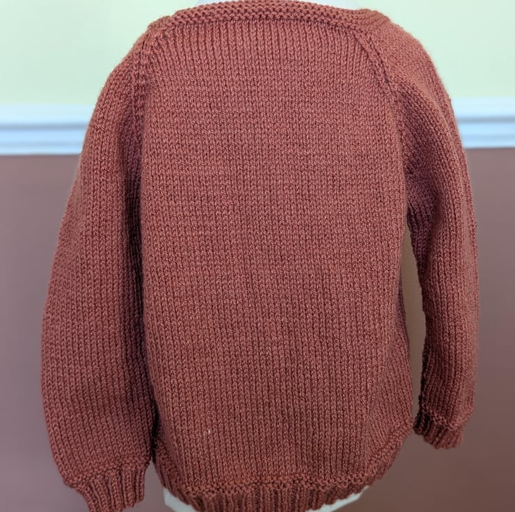Hand knitted child's long sleeved jumper from King Cole Yarn. Knitted with stocking stitch and garter stitch triangle at neck.