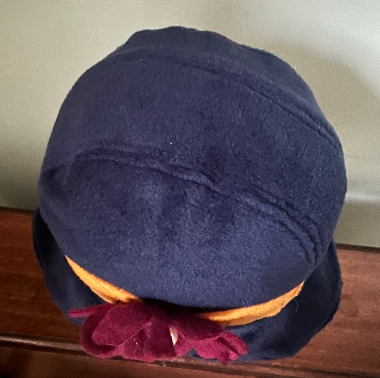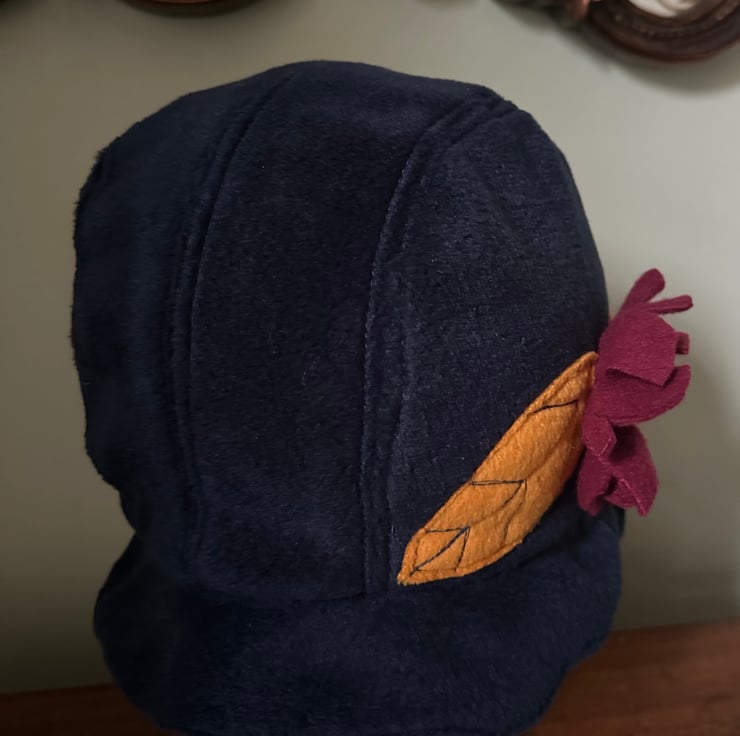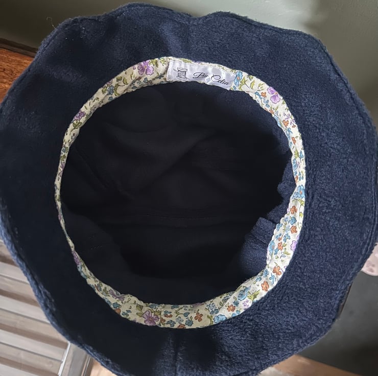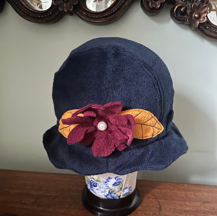 My 1920's,1930's style cloche, flapper hat is made from soft navy blue fleece, with a fleece red and yellow flower decoration and an faux pearl. It is ideal for those cold days being stylish, cosy and comfortable to wear. The hat is for a head size up to 23ins or 58cm.