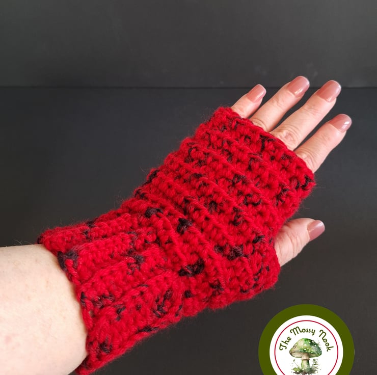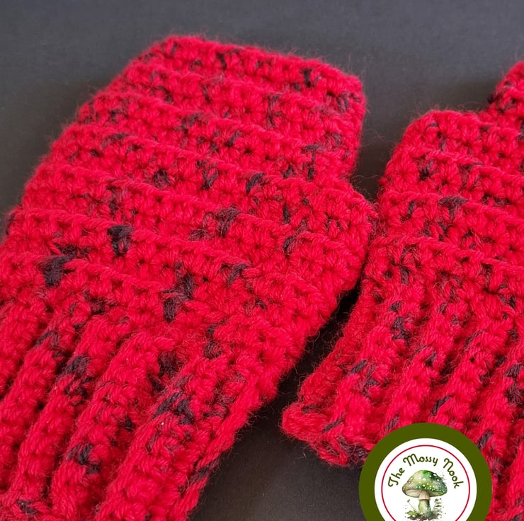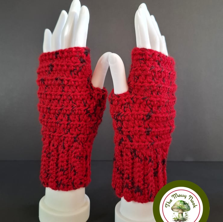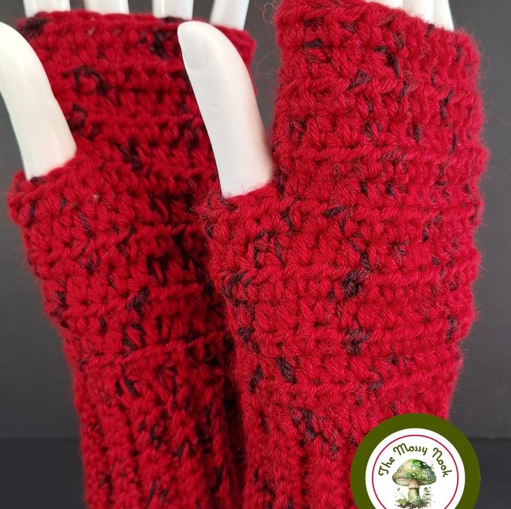 I handmade these soft, chunky fingerless mittens using a luxury yarn of 70% wool, 15% cashmere, and 15% polyester. They are smooth, snuggly, and perfect for keeping your hands toasty warm while leaving your fingertips uncovered.