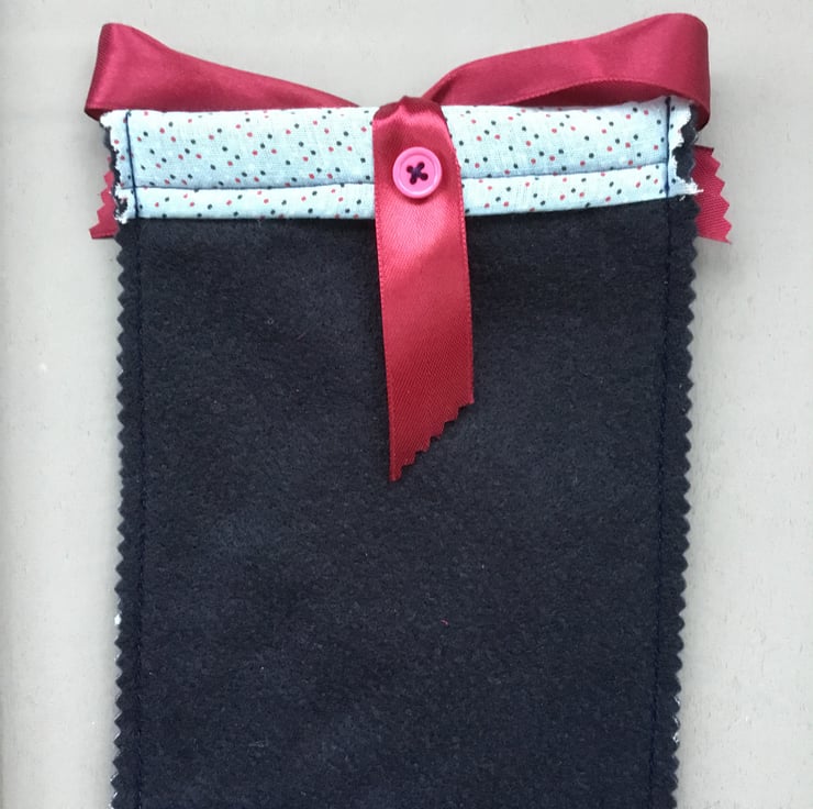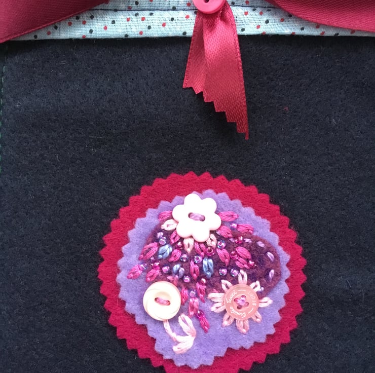 This Hand Embroidered Felt Bag is lined with cotton fabric in a pale blue, with dark pink, white and navy blue spots. This Navy Blue Felt Bag is tied with a dark red satin ribbon, secured with pink buttons at the top.