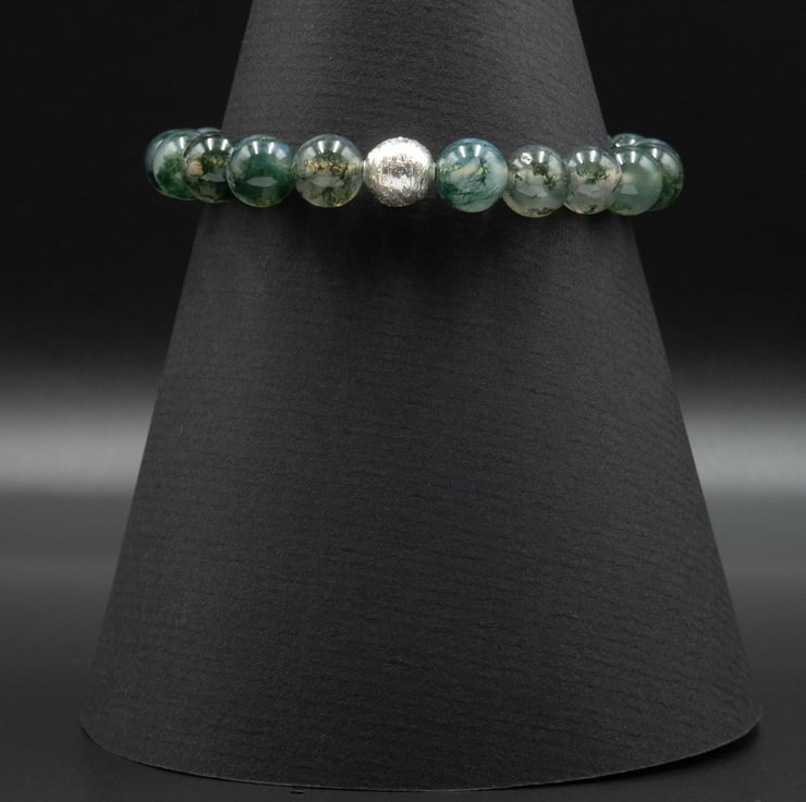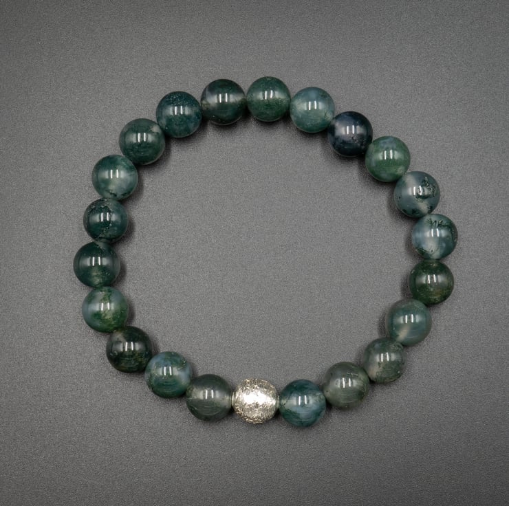 Gorgeous earthy tone soft green moss agate 8mm rounds are used for this simple, classic bracelet with a Karen Hill tribe sterling silver bead to accent.