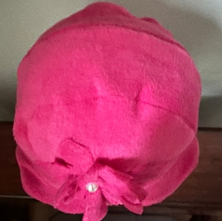 My 1920's,1930's style cloche, flapper hat is made from soft pink fleece with a fleece flower decoration and a faux pearl. It is ideal for those cold days being stylish, cosy and comfortable to wear. The hat is for a head size up to 23ins or 58cm.
