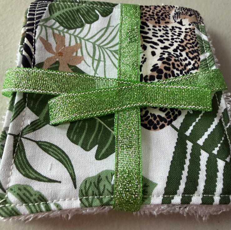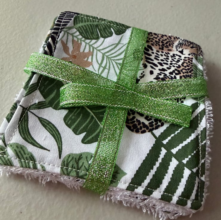 A pack of matching 4” reusable face pads, handmade using bamboo towelling and cotton fabric. This set is made from white material with green leaves and leopards roaming through the jungle.