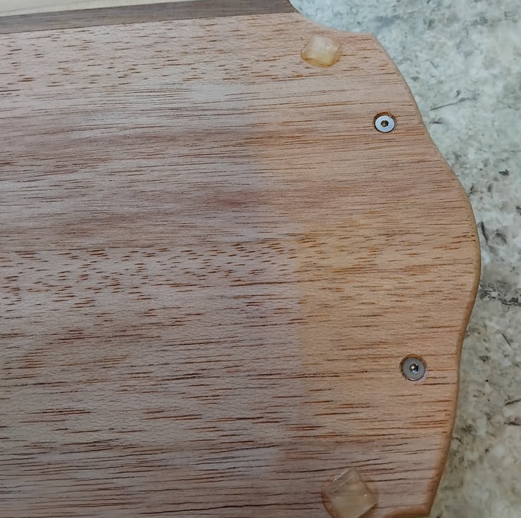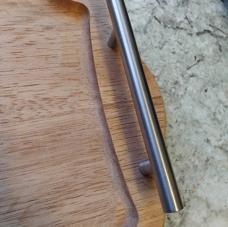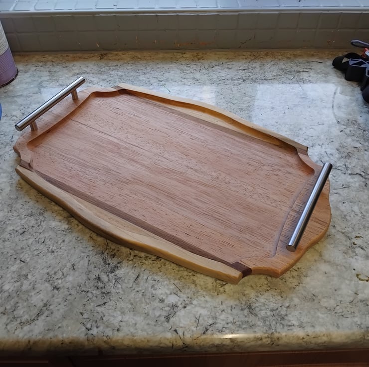 mixed wood serving tray, stainless steel handles 48cm x 30cm, finished in food safe wood sealer, rubber feet on the base to stop scratching the work surface, ideal serving tray for mugs, cups, cakes, sandwiches ,or just a tidy tray.