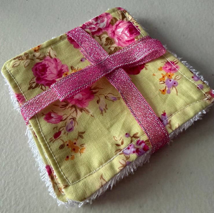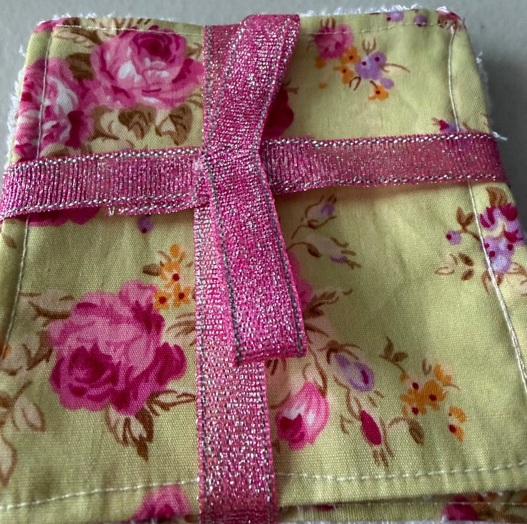 A pack of matching 4” reusable face pads, handmade using bamboo towelling and cotton fabric. This set is made from green material with red and pink flowers on.